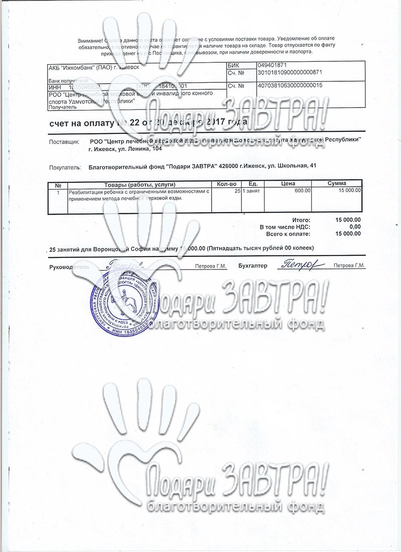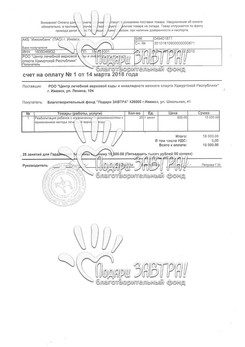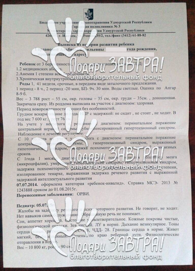 Альбина ГардановаВозраст: 12 лет Город: г. Ижевск Диагноз: Врожденный порок развития головного мозга (микроцефалия), симптоматическая эпилепсия, синдром Денди-Уолкера Оплачено: 52 137 руб. 06-08-2019 Оплачены реабилитационные мероприятия на летнем слете «Дети-ангелы». Альбина прошла курс занятий с дефектологом, логопедом, курс иппотерапии и аквареабилитации. Подробнее>> 25-10-2018 Оплачена реабилитация на слете «Дети-ангелы» (9 200 руб.) Подробнее>>> 04-04-2018 Оплачен курс иппотерапии (15 000 руб.) Подробнее>>> 14-13-2018 Счет на оплату за реабилитацию с применением метода лечебной верховой езды (15 000 руб.) Подробнее>>> 21-12-2017 Оплачен курс иппотерапии (15 000 руб.) Подробнее>>> 20-12-2017 Счет на оплату за реабилитацию с применением метода лечебной верховой езды (15 000 руб.) Подробнее>>> 20-12-2017 Начат сбор средств для оплаты иппотерапии Тяжелые роды (после относительно легкой беременности) Динара Гарданова вспоминает с ужасом. Роды пришлось вызывать искусственно и в экстренном порядке — после неудовлетворительного КТГ плода. Дальше как во сне — 8 часов безводного периода, кислородное голодание и зажатие головы ребенка. На пятый день маму с малышкой выпишут с диагнозом в медкарте: «хроническая внутриутробная гипоксия». Проблемы нарастали как снежный ком — в первые два месяца дочь плохо набирала вес, а позже родители заметили отставание в развитии - невролог поставил их на учёт. К году Альбина не могла ни сидеть, ни стоять, ни тем более ходить. Недоразвитие головного мозга — вынесут вердикт медики, посоветовав оформить инвалидность. Альбина — постоянная пациентка клиники «Нейрон» и республиканского реабилитационного Центра. Прошла курс в медицинском центре «Первый шаг» (Казань). Различные виды массажей, ЛФК, иглорефлексотерапия, занятия в костюмах «Адели» и «Ардос» оказались эффективными — девочка стала стоять у опоры, и ходить с поддержкой. В 2016 году семья столкнулась с новым испытанием — у Альбины начались эпилептические приступы. На фоне приема противосудорожных препаратов результативность реабилитационных занятий снизилась. А крупные клиники страны стали отказывать в прохождении курсов. Родители продолжают искать (подходящие им по показаниям) медицинские центры, в том числе среди зарубежных. Сейчас Альбина посещает логопеда и психолога, ходит в бассейн и на ипподром. От регулярных тренировок на лошадях Гардановы отказываться не хотели бы, но оплачивать их самостоятельно становится всё сложнее. Постоянно приходится чем-то жертвовать. Вся надежда — на отзывчивых людей. Только сообща, верит мама Альбины, получится приблизиться к их заветной цели: её любимая дочь будет и ходить, и говорить. Медицинские документы