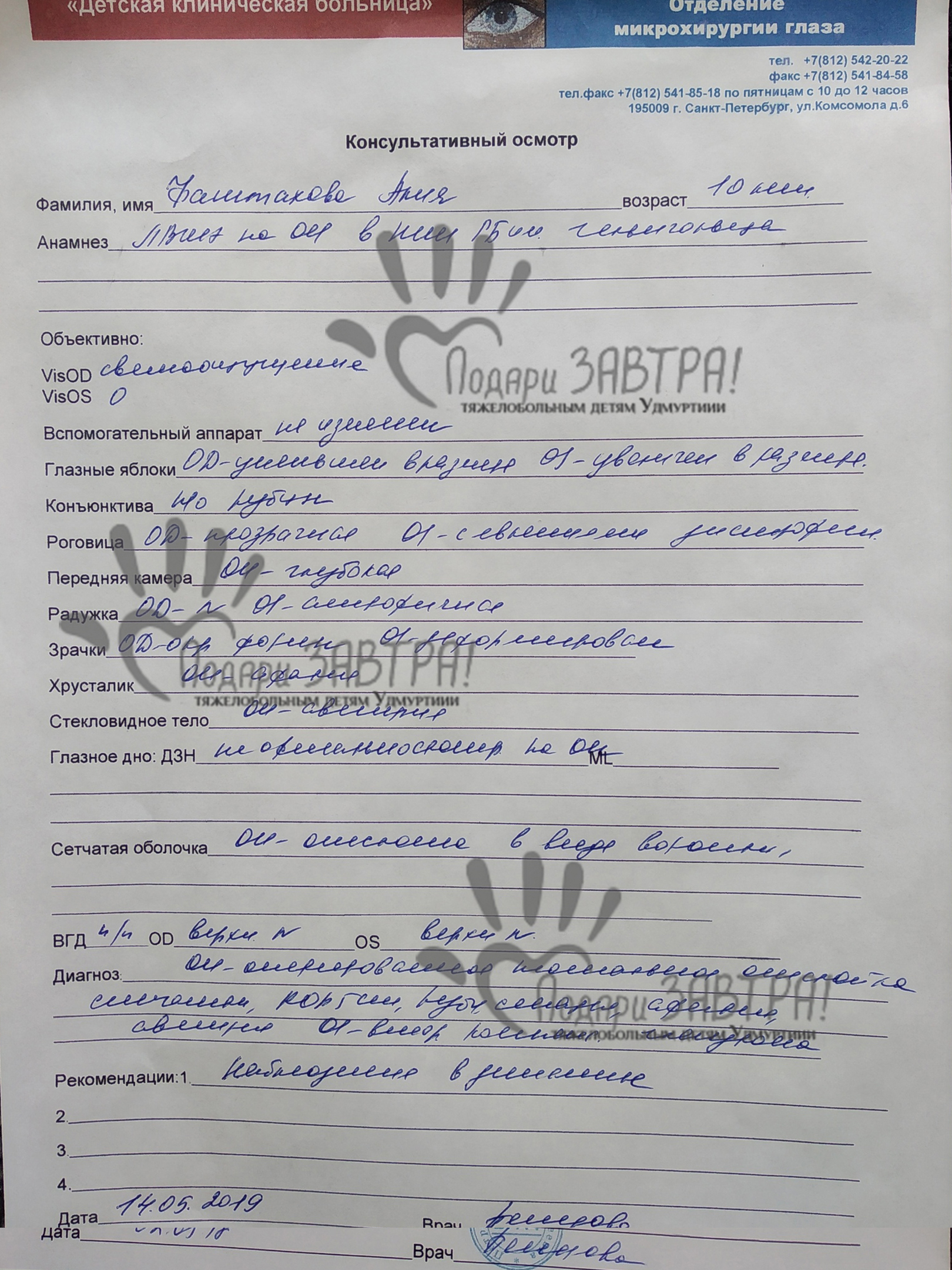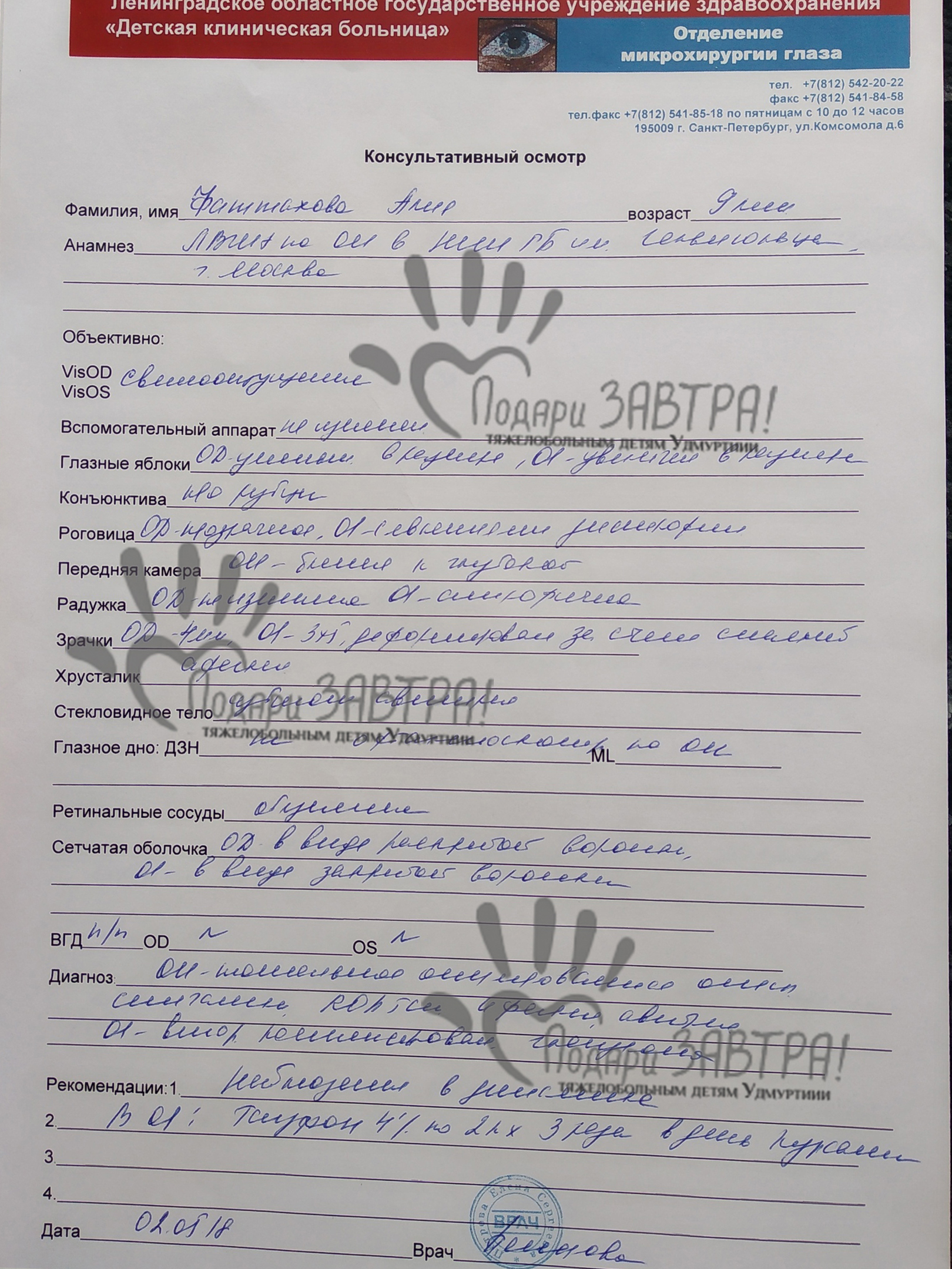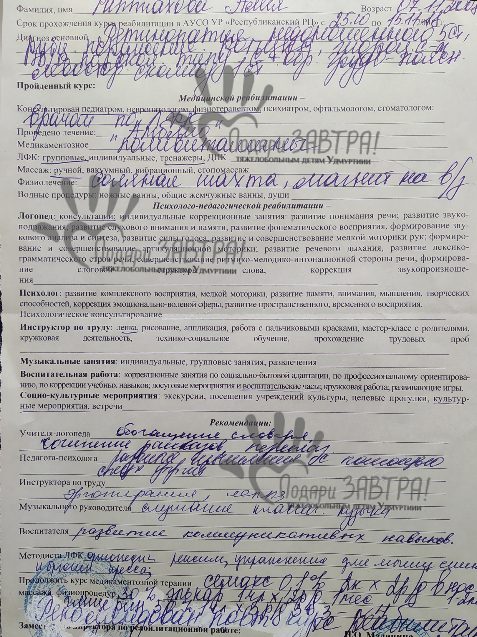 Алия ФаттаховаВозраст: 17 лет Город: г. Ижевск Диагноз: Ретинопатия недоношенных 5 степени Оплачено: 15 000 руб. 17-05-2019 Оплачены курсы иппотерапии (15 000 руб.) Подробнее>>> 13-05-2019 Счет на оплату за реабилитацию с применением метода лечебной верховой езды (15 000 руб.) Подробнее>>> Беременность мамы Алии протекала с угрозой, и на 27 неделе началась отслойка плаценты. Так, на таком небольшом сроке, на свет появилась малышка Алия. При рождении она весила всего 980 грамм при росте 34 сантиметра. Настоящая Дюймовочка! Не о таком появлении на свет своего первенца мечтали родители. И праздничный день 7 ноября 2008 года в семье Фаттаховых оказался совсем не праздничным. После родов малышка сразу оказалась в реанимации – искусственная вентиляция легких, кормление через зонд, круглосуточные капельницы. Через какое-то время, чуть окрепшую девочку, перевели в отделение патологии новорожденных, где больше двух месяцев Алия проходила интенсивную терапию, училась кушать из бутылочки. В это время мама и врачи считали каждый набранный ею грамм. Только после нового года – 4 января 2009 года Алию с многочисленными диагнозами и ее маму выписали домой. Список диагнозов оказался очень внушительным - сепсис новорожденного с сочетанной этиологией, септицемия, двухсторонняя пневмония, гнойный конъюнктивит, сопутствующие диагнозы – последствия гипоксического и ишемического поражения ЦНС 3 степени, задержка психомоторного развития, риск на нейроретинопатию обоих глаз, анемия новорожденного с сочетанной этиологией, нарушение сердечно-сосудистой системы. В 8 месяцев прибавился еще один диагноз – ретинопатия недоношенных 4-5 степени рубцовая фаза обоих глаз. Родители даже не могли предположить, что означает диагноз и какие последствия повлечет за собой. А последствия оказались очень серьезными. Произошла отслойка сетчатки обоих глаз и Алия ослепла. В 9 месяцев сделали операцию в городе Москва, где чудом получилось сохранить светоощущение, но только на правом глазике. Предметного зрения у девочки сохранить не удалось. На данный момент Алие 10 лет. Она перешла в 4 класс коррекционной школы для слепых детей. Она очень жизнерадостная, общительная, любознательная, веселая, очень старательная, хорошо учится в школе, в основном на пятерки. Алия занимается пением, играет на фортепиано, плавает в бассейне, играет в инклюзивном театре, занималась в студии танца и очень любит выступать на сцене. Еще Алие очень нравится иппотерапия. Это специальный комплекс лечебных процедур, связанных с лошадью. Иппотерапия позволяет поддерживать физическую активность ребенка, развивать мышечный корсет, проводить психоэмоциональную коррекцию. К сожалению, иппотерапия в республике достаточно затратное направление, и родителям девочки необходима ваша финансовая помощь. Сумма невелика – 7500 рублей в месяц, но очень значима для семьи. Мы будем благодарны за любую посильную вам помощь! Медицинские документы
