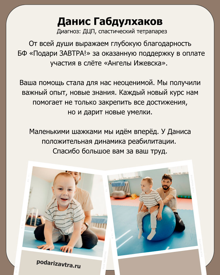 Данис ГабдулхаковВозраст: 4 года Город: д. Шудья Диагноз: ДЦП, спастический тетрапарез Оплачено: 429 300 рублей Данис родился в многодетной семье. Он третий и очень долгожданный ребёнок. Беременность проходила без каких-либо нарушений, роды прошли хорошо. Данис рос по возрасту, с трёх месяцев уже держал голову. Но с пятого месяца родители начали замечать, что сын был скован, зажат. Врач назначил массаж и парафинотерапию, но это не помогло. Время шло, Данис рос, но прогресса в развитии не было. После всех обследований, в 1 год и 5 месяцев, Данису поставили диагноз: ДЦП, спастический тетрапарез. Данис самостоятельно не сидит, не стоит, не ходит. Мальчик умеет только ползать по-пластунски. Он пока не разговаривает, но интеллект сохранён. С периодичностью понимает, что ему говорят. Данис плохо берёт предметы правой рукой, левая рука работает получше. Поэтому мальчик почти ничего не может делать самостоятельно. Для восстановления функций тела, ему нужна постоянная реабилитация. Давайте подарим Данису здоровое и счастливое ЗАВТРА! Медицинские документы