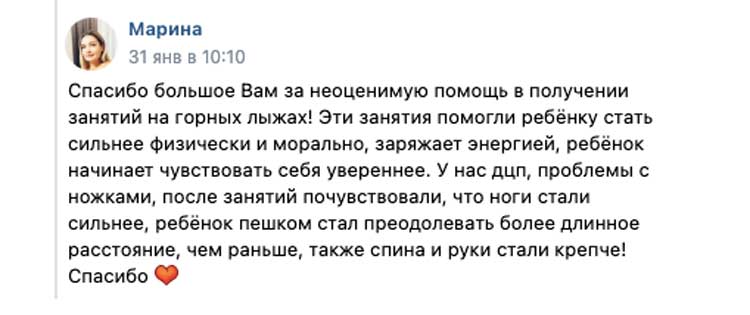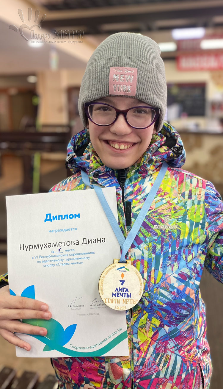 Диана НурмухаметоваВозраст: 15 лет Город: г. Можга Диагноз: ДЦП, спастическая диплегия Оплачено: 24 тысяч рублей 29-02-2024 Оплата за услуги (13 000 руб.) Подробнее>>> 25-01-2024 Счет на оплату по проекту «Лыжи мечты» (13 000 руб.) Подробнее>>> 15-04-2023 Акт за оказание помощи: реабилитация по программе «Лыжи мечты» Подробнее>>> 15-02-2023 Оплата за услуги (11 000 руб.) Подробнее >>> 24-12-2022 Счет на оплату по проекту «Лыжи мечты» (11 000 руб.) Подробнее>>> 24-12-2022 Открыт сбор для Дианы Нурмухаметовой Диана родилась недоношенным ребёнком. С рождения у Дианы проблемы со здоровьем: с ногами (начала ходить в 2 года), со зрением. И почти всё время девочка проводила в больницах. Диана перенесла операции на ногах в Питере и глазах в Ижевске. С 5 лет посещает развивающие занятия: ментальная арифметика, математика, чтение и письмо, английский, программирование и другие творческие кружки. После школы, дважды в неделю Диана плавает в бассейне. А с января 2022 катается на горных лыжах, пробуем сноуборд, а летом ролики в «Нечкино». «Мы не сдаёмся, в настоящее время стараемся больше налегать на спорт, больше физического развития. Надеемся, что нам помогут в этом!». Давайте поможем Диане и подарим девочке счастливое и здоровое ЗАВТРА! Медицинские документы