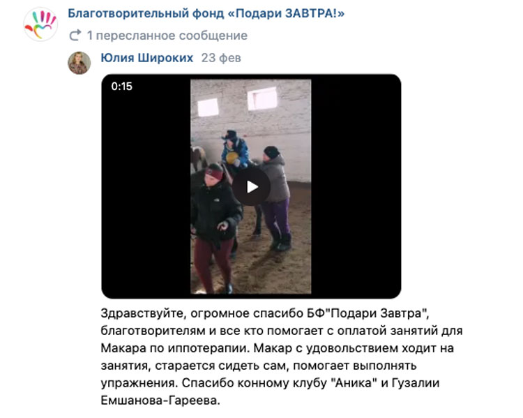 15-04-2025 Оплата на оплату за услуги ребенку с ограниченными возможностями с применением метода иппотерапии и адаптивной верховой езды (АВЕ) (14 000 руб.) Подробнее>>>