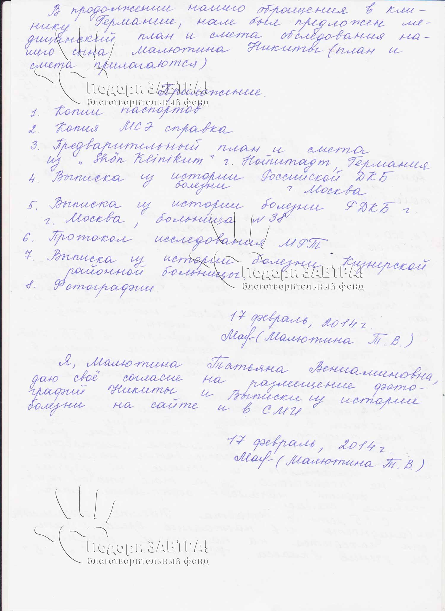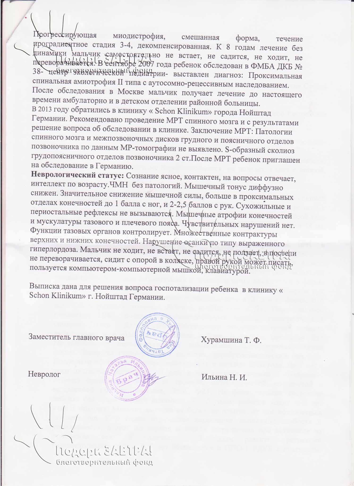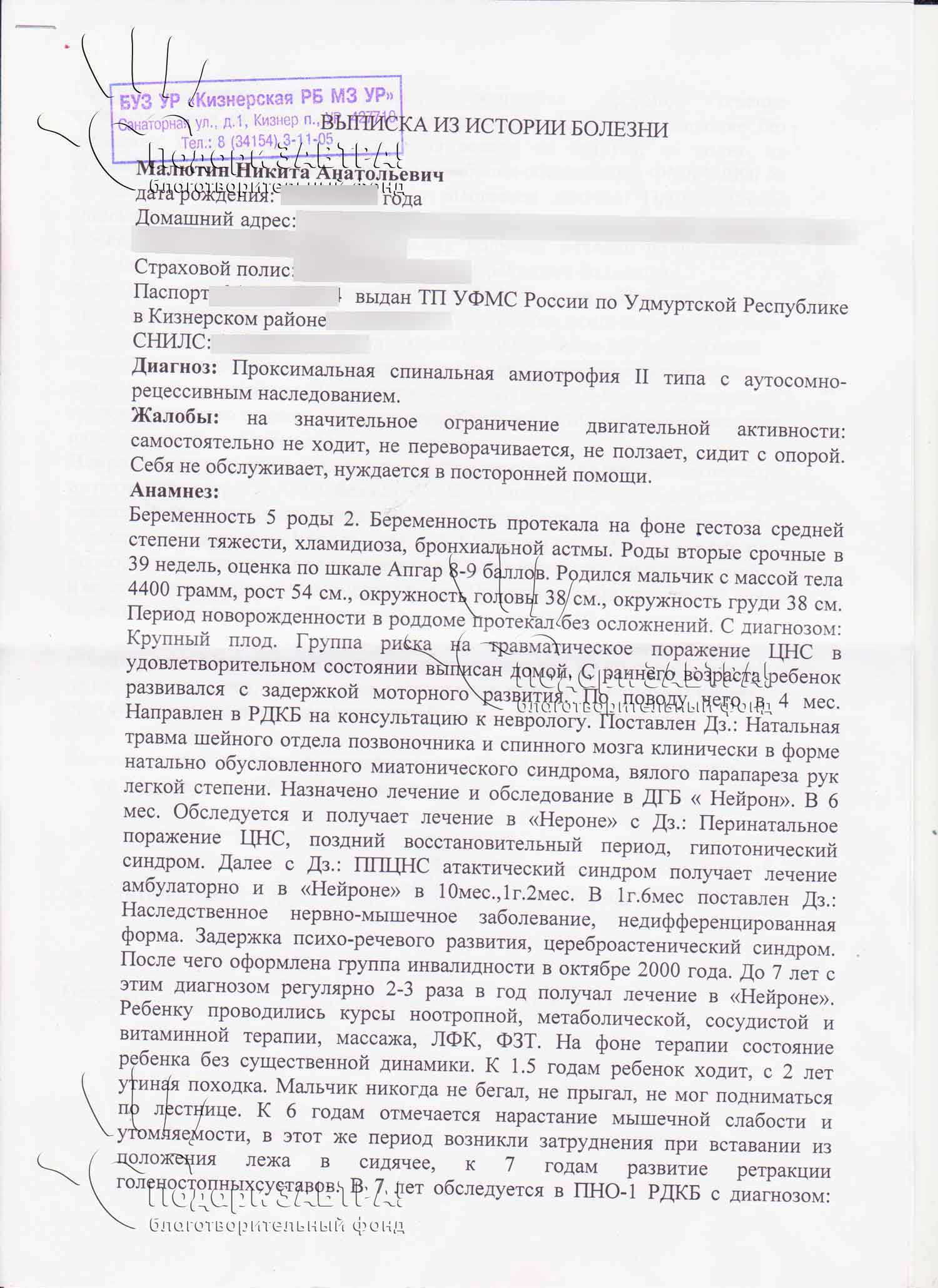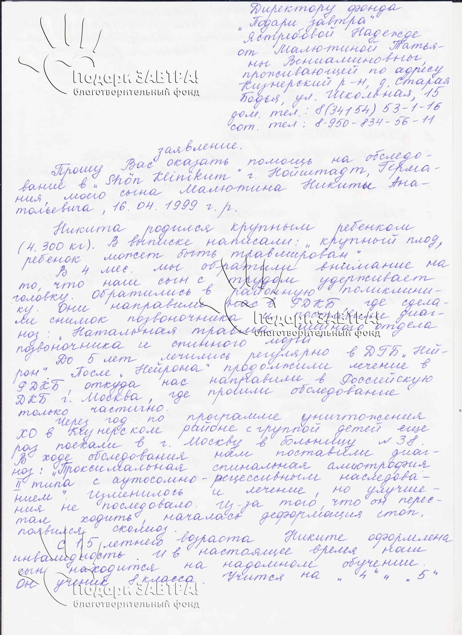 31-03-2014 Оплачена лечебная путевка для Никиты Малютина в клинике «Sh n Klinikum» г. Нойштадт, Германия. Подробнее>>> 26-02-2014 Счет на оплату медицинских услуг. (1 076 евро) Подробнее>>> 25-02-2014 Начат сбор Никите Малютину. Подробнее>>> Детство Никиты было счастливым и безоблачным, он родился здоровым ребенком. Спустя семь лет мальчик оказался прикованным к инвалидному креслу. Никита прошел обследование у лучших профессоров Ижевска и Москвы, а также курс восстановительных процедур, капельницы, уколы, массаж. Меры оказались неэффективными. Никита с трудом держит спину ровно, голова запрокидывается набок. Ухаживать за сыном родителям становится все тяжелее, 14-летнего подростка приходится носить на руках. Сейчас у семьи Малютиных появилась надежда. Одна из клиник Германии готова принять Никиту, провести полное обследование и при положительном результате прооперировать. В этом случае Никита сможет вернуться к полноценной жизни, снова научится стоять и ходить! «SCHÖN KLINIK» является одной из главных немецких медицинских учреждений. Специализация: хирургия, нервопатология, нервопедиатрия, медицина, направленная на восстановление организма. В городе Нойштадт функционирует одна из лучших в мире клиник хирургии позвоночника, которая тоже относится к комплексу Schön. В составе нойштадтской клиники – два высокоспециализированных центра, оснащенных по последнему слову медицинской техники, в которых заняты лучшие профессионалы из области ортопедической хирургии. Специалисты клиники занимаются любыми случаями повреждения позвоночника и его отдельных участков – будь то врожденные нарушения, последствия травм или дегенеративного вырождения костных и хрящевых тканей. Если тонкие диагностические исследования указывают на возможность консервативного лечения, пациент получает его в полной мере, с реальной перспективой выздоровления. Затраты на лечение очень высоки. Для реабилитации необходимо собрать больше 3000 евро, что для семьи Малютиных является неподъемной суммой. Фонд «Подари ЗАВТРА!» взял на себя медицинские расходы - 1076 евро. Помогите Никите! Подарите ему полноценную жизнь! Татьяна Решетникова Медицинские документы