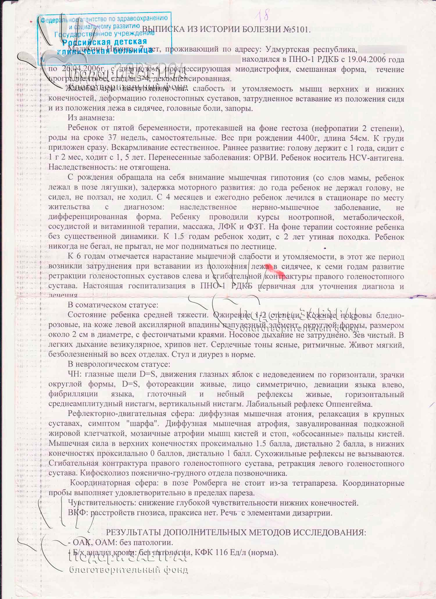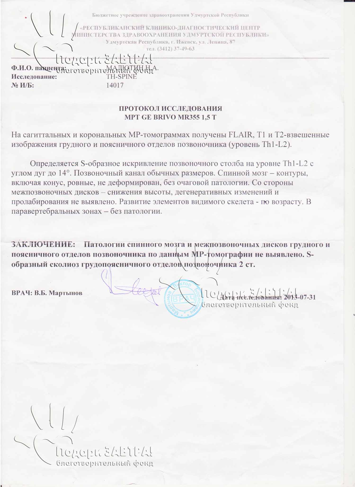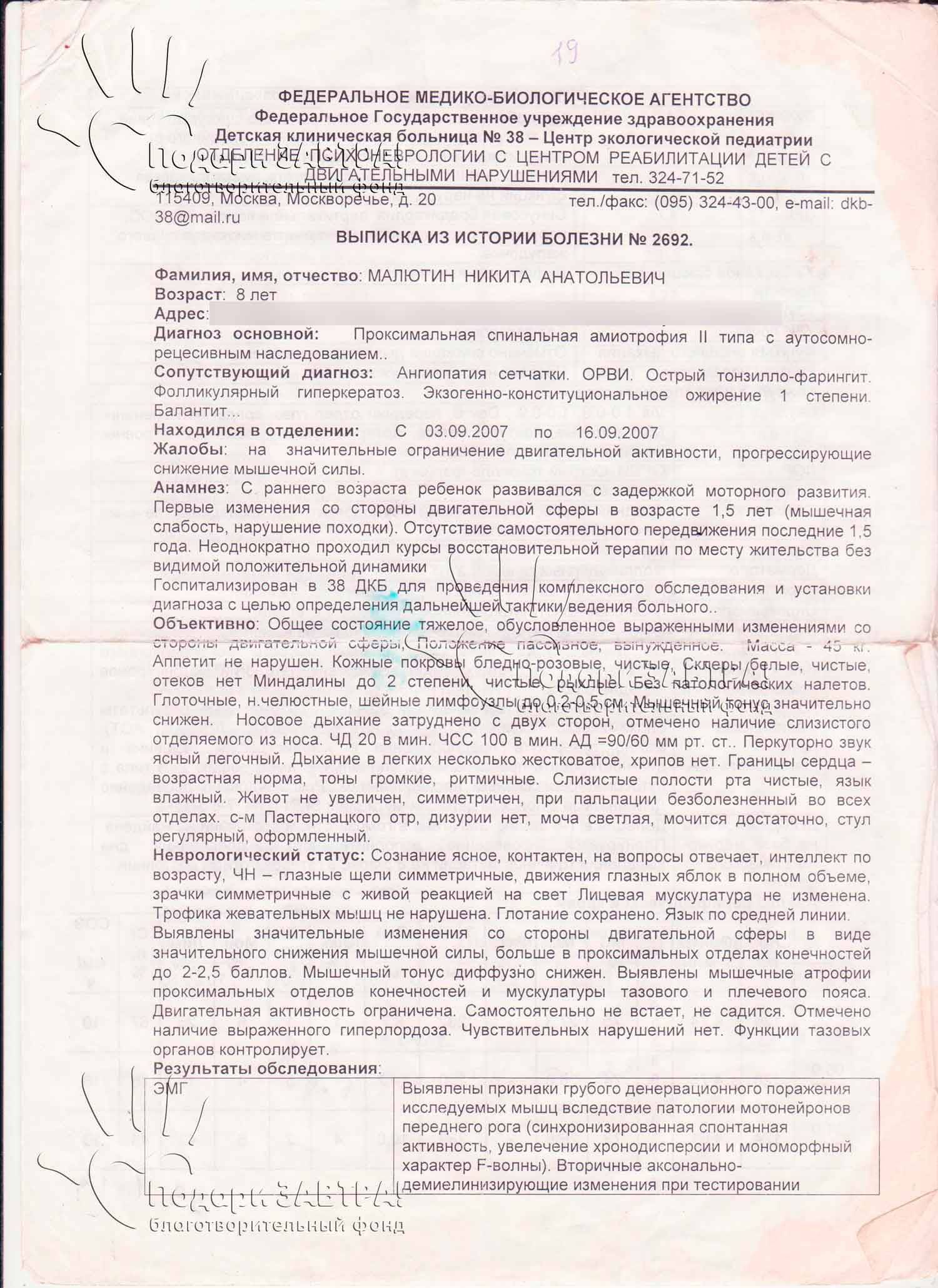 31-03-2014 Оплачена лечебная путевка для Никиты Малютина в клинике «Sh n Klinikum» г. Нойштадт, Германия. Подробнее>>> 26-02-2014 Счет на оплату медицинских услуг. (1 076 евро) Подробнее>>> 25-02-2014 Начат сбор Никите Малютину. Подробнее>>> Детство Никиты было счастливым и безоблачным, он родился здоровым ребенком. Спустя семь лет мальчик оказался прикованным к инвалидному креслу. Никита прошел обследование у лучших профессоров Ижевска и Москвы, а также курс восстановительных процедур, капельницы, уколы, массаж. Меры оказались неэффективными. Никита с трудом держит спину ровно, голова запрокидывается набок. Ухаживать за сыном родителям становится все тяжелее, 14-летнего подростка приходится носить на руках. Сейчас у семьи Малютиных появилась надежда. Одна из клиник Германии готова принять Никиту, провести полное обследование и при положительном результате прооперировать. В этом случае Никита сможет вернуться к полноценной жизни, снова научится стоять и ходить! «SCHÖN KLINIK» является одной из главных немецких медицинских учреждений. Специализация: хирургия, нервопатология, нервопедиатрия, медицина, направленная на восстановление организма. В городе Нойштадт функционирует одна из лучших в мире клиник хирургии позвоночника, которая тоже относится к комплексу Schön. В составе нойштадтской клиники – два высокоспециализированных центра, оснащенных по последнему слову медицинской техники, в которых заняты лучшие профессионалы из области ортопедической хирургии. Специалисты клиники занимаются любыми случаями повреждения позвоночника и его отдельных участков – будь то врожденные нарушения, последствия травм или дегенеративного вырождения костных и хрящевых тканей. Если тонкие диагностические исследования указывают на возможность консервативного лечения, пациент получает его в полной мере, с реальной перспективой выздоровления. Затраты на лечение очень высоки. Для реабилитации необходимо собрать больше 3000 евро, что для семьи Малютиных является неподъемной суммой. Фонд «Подари ЗАВТРА!» взял на себя медицинские расходы - 1076 евро. Помогите Никите! Подарите ему полноценную жизнь! Татьяна Решетникова Медицинские документы
