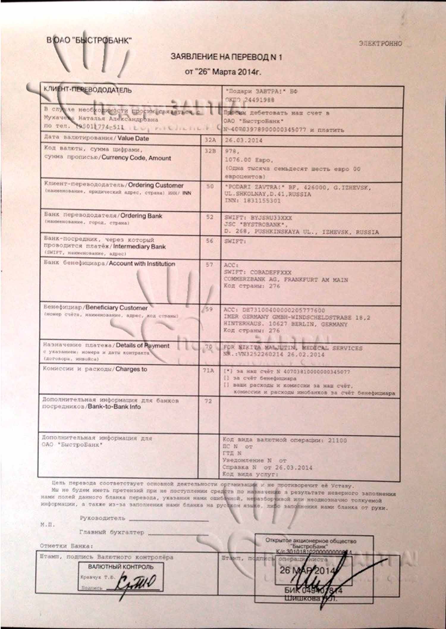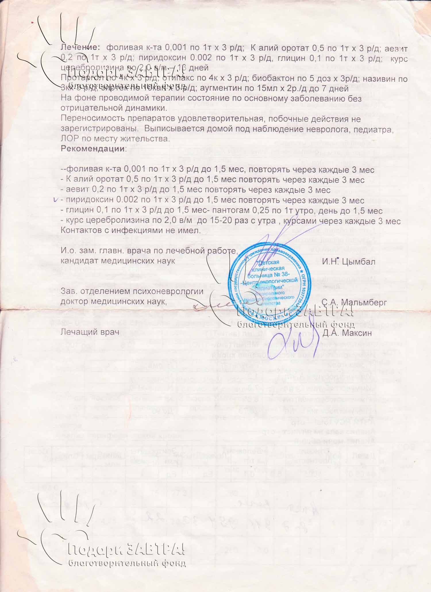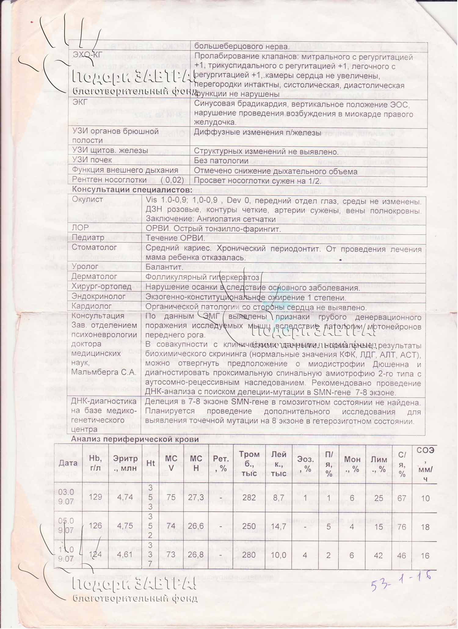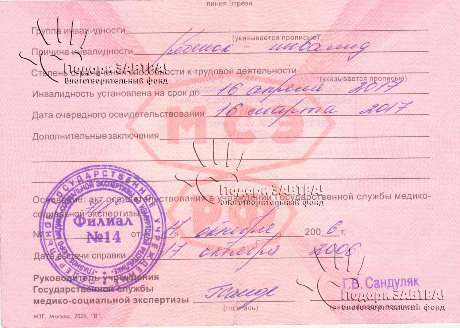 31-03-2014 Оплачена лечебная путевка для Никиты Малютина в клинике «Sh n Klinikum» г. Нойштадт, Германия. Подробнее>>> 26-02-2014 Счет на оплату медицинских услуг. (1 076 евро) Подробнее>>> 25-02-2014 Начат сбор Никите Малютину. Подробнее>>> Детство Никиты было счастливым и безоблачным, он родился здоровым ребенком. Спустя семь лет мальчик оказался прикованным к инвалидному креслу. Никита прошел обследование у лучших профессоров Ижевска и Москвы, а также курс восстановительных процедур, капельницы, уколы, массаж. Меры оказались неэффективными. Никита с трудом держит спину ровно, голова запрокидывается набок. Ухаживать за сыном родителям становится все тяжелее, 14-летнего подростка приходится носить на руках. Сейчас у семьи Малютиных появилась надежда. Одна из клиник Германии готова принять Никиту, провести полное обследование и при положительном результате прооперировать. В этом случае Никита сможет вернуться к полноценной жизни, снова научится стоять и ходить! «SCHÖN KLINIK» является одной из главных немецких медицинских учреждений. Специализация: хирургия, нервопатология, нервопедиатрия, медицина, направленная на восстановление организма. В городе Нойштадт функционирует одна из лучших в мире клиник хирургии позвоночника, которая тоже относится к комплексу Schön. В составе нойштадтской клиники – два высокоспециализированных центра, оснащенных по последнему слову медицинской техники, в которых заняты лучшие профессионалы из области ортопедической хирургии. Специалисты клиники занимаются любыми случаями повреждения позвоночника и его отдельных участков – будь то врожденные нарушения, последствия травм или дегенеративного вырождения костных и хрящевых тканей. Если тонкие диагностические исследования указывают на возможность консервативного лечения, пациент получает его в полной мере, с реальной перспективой выздоровления. Затраты на лечение очень высоки. Для реабилитации необходимо собрать больше 3000 евро, что для семьи Малютиных является неподъемной суммой. Фонд «Подари ЗАВТРА!» взял на себя медицинские расходы - 1076 евро. Помогите Никите! Подарите ему полноценную жизнь! Татьяна Решетникова Медицинские документы
