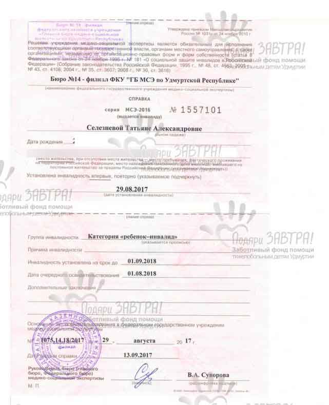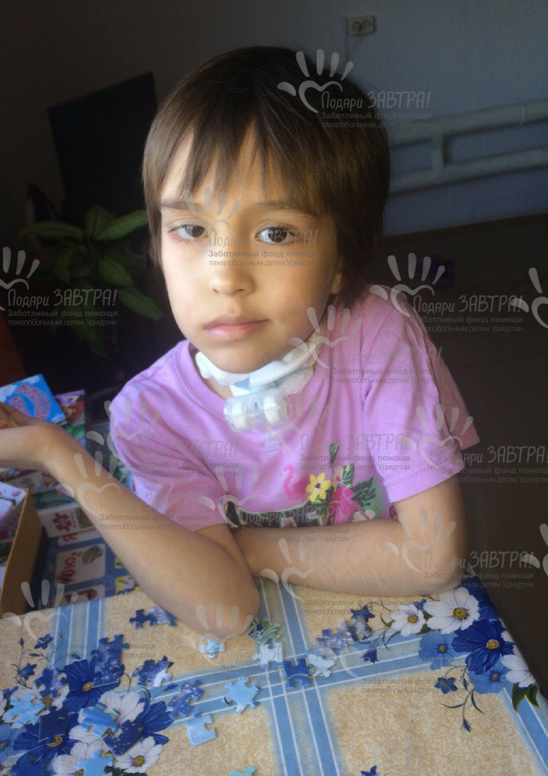 Таня СелезневаВозраст: 14 лет Город: г. Ижевск Диагноз: Анапластическая эпендимома черва мозжчка, М0-стадия Оплачено: 16 290 руб. 31-07-2018 Мы оплатили расходные материалы для дыхателльной функции (16 290 руб.) Подробнее >>> 12-07-2018 Танечка – третий ребенок в семье, младшая, любимая девочка. Умница, мамина помощница. Беда в ее семью пришла в прошлом году. В феврале Таня заболела, долго кашляла, была слабенькой. Врачи лечили ребенка от ОРВИ, но не помогало. А потом Танечка упала... Родители ребенка были в огороде, занимались посадками, а дочка играла в чулане. В какой-то момент мама услышала шум. Оказывается, Таня поскользнулась и упала, прямо на голову. Мама прибежала к дочке. Она не плакала даже, просто выглядела напуганной. Но Тане сразу стало хуже: начала болеть шея, спина, появились сильные головные боли. Родители обратились к врачам. Три недели врачи лечили Таню от остеохондроза, но лечение не помогало. Тем временем, девочка таяла на глазах, мама настаивала на компьютерной томографии. 6 июня Таню отправили в г. Глазов на томографию. Снимки показали, что у Танечки огромная опухоль, гидроцефалия. Девочку сразу поместили под капельницу и экстренно, на «скорой», повезли в Ижевск. В Ижевске им сказали, что опухоль злокачественная, это рак. И что, возможно, она с Таней давно, но падение на голову спровоцировало ее рост. 9 июня малышке провели первую операцию на мозге. Неудачную: ижевские врачи не смогли удалить злокачественную опухоль полностью. Вся проблема в ее расположении. Танина «зараза» выросла прямо на стволе головного мозга, там где расположен мозжечок, и удалять ее опасно, так как именно в этом месте много нервных центров, которые отвечают за жизненно важные функции. Поэтому на все лето девочку положили в гематологическое отделение, проводили химиотерапию. Но и она не помогла. Время шло, росли и риски. В сентябре Танюшу определили в Москву. Помочь девочке согласились в клинике Рогачева и Бурденко. Они выбрали Бурденко, и в октябре приехали в Москву. 31 октября в ГВКГ им. Бурденко Танечке полностью удалили опухоль, но при операции задели нервы. Теперь девочка не может сама дышать, не может питаться сама. Сначала Таня кушала через зонд, но недавно ей поставили гастростому – трубочку, которая ведет прямо в желудок. Все эти 5 месяцев мама с Таней жили в Москве под наблюдением врачей. Наконец, 2 апреля их выписали домой. Конечно, девочка еще будет под наблюдением: необходимо отправлять в Москву снимки МРТ сначала каждые три месяца, потом раз в год, нужно следить, чтобы опухоль вновь не появилась. Танюшка все понимает, но не сдается, хотя ей всего 6 лет! Она – боец, цепляется за жизнь. У девочки парез правой стороны, она уже научилась писать левой рукой – готовится к школе. Недавно начала ходить самостоятельно, до этого могла только с поддержкой. За Танечкой нужен особенный уход: ей нужны расходники для гастростромы, трахеостомические трубки, особые салфетки, термовенты дыхательные, голосообразующие насадки. Сумма за месяц набегает под 15 000 рублей! Это вся Танечкина пенсия, и такие расходы родителя девочки позволить себе не могут. Давайте поможем Тане обрести счастливое завтра! Медицинские документы