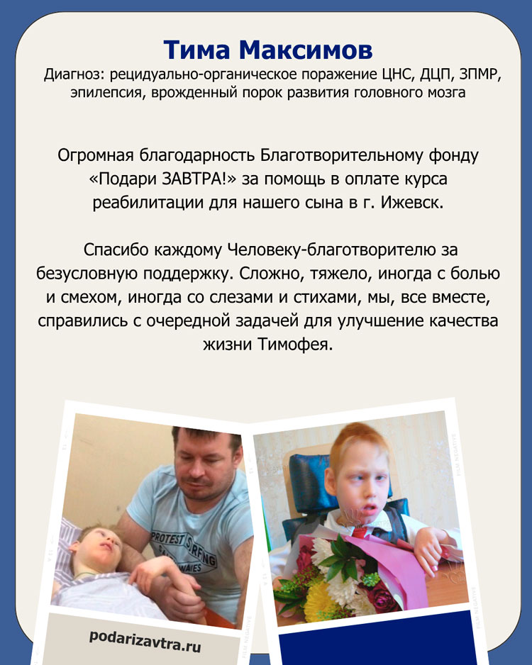 Тима МаксимовВозраст: 15 лет Город: с. Завьялово Диагноз: Рецидуально-органическое поражение ЦНС, ДЦП, ЗПМР, эпилепсия, врожденный порок развития головного мозга, тетрапарез, гиепркинезы Оплачено: 184 600 рублей 24-10-2025 Оплата за курс массажа (25 000 руб.) Подробнее>>> 25-10-2024 Оплата за курс массажа и ЛФК (40 000 руб.) Подробнее>>> 29-03-2024 Оплата за курс ЛФК (20 000 руб.) Подробнее >>> 29-03-2024 Оплата за курс массажа (20 000 руб.) Подробнее >>> 29-03-2023 Акт за оказание помощи: курс массажа и ЛФК на слете «Дети ангелы» Подробнее>>> 29-03-2023 Оплата за курс массажа и ЛФК (40 000 руб.) Подробнее >>> 21-06-2022 Оплата за курс массажа (39 600 руб.) Подробнее>>> 01-06-2022 Акт за оказание помощи: массаж, ЛФК Подробнее>>> 06-08-2019 Оплачены реабилитационные мероприятия на летнем слете «Дети-Ангелы». Тимофей прошел курс ЛФК (лечено-физкультурный комплекс), массажа и курс занятий с логопедом. Подробнее>> 07-06-2019 Начат сбор средств на реабилитацию Тимофея на летнем слёте «Дети-Ангелы» Тимофей - жизнерадостный улыбчивый мальчик, живущий в любящей заботливой семье с мамой, папой и двумя братишками. Родившись на 34 недели он был здоров, но очень слаб. Чтобы окрепнуть, сразу после рождения, понадобилось полтора месяца больничных процедур: в реанимации, в отделении патологии новорожденных и недоношенных РДКБ г.Ижевска. Дальше - обычная жизнь обычного ребенка: расти, развиваться, догнать сверстников, но этого не получалось... После первых прививок полиомиелита и гепатита в пол года, начались странности: стали косить глаза, Тима перестал держать голову, бросил попытки ползать; после второй прививки начались приступы, общая мышечная слабость. Страх и растерянность поселились в семье. Ребенок, который, по словам врачей, ''скоро догонит'', теперь был на противосудорожных препаратах, лежал и заразительная улыбка исчезла! Лечение не помогало, ремиссии не было, препаратов становилось больше они постоянно менялись. Тимоша мог не спать сутками, потом наоборот - спать весь день, его приходилось будить, чтобы хоть накормить, двигательная активность угасла, глаза были затуманены - он то плакал, то истерически смеялся. Все реабилитационные мероприятия категорически запретили. Т.к. результаты МРТ были со сложными изменениями, федеральные лечебные учреждения не брали на обследование, тем более на лечение. Для исключения генетической патологии, мальчику получилось попасть на консультацию в ФГБУ «Медико-генетический научный центр РАМН» в мае 2013 года. После длительных просьб и очередей, Тимофея взяли на обследование в ФГБУ «Московский Научно-исследовательский институт педиатрии и детской хирургии Минздрава России» (Отделение психоневрологии и эпилептологии) в ноябре 2013 г., где специалисты по ЭЭГ предположили, что эпиактивности нет, но лечение не подкорректировали, т.к. приступы не останавливались. Только осенью 2015 года специалистами Психолого-неврологического центра Д. Е. Зайцева Санкт-Петербурга было подтверждено предположение: эпилепсии нет и не было, приступы - разновидность гиперкинезов. Врачи ошиблись! После отмены противосудорожных препаратов к Тимофею вернулась его очаровательная улыбка, наладился сон, появился интерес к окружающему миру. Сейчас Тимочка плохо держит голову, не умеет сам сидеть, редко переворачивается со спины на живот и обратно, не может говорить, но умеет губами показывать некоторые буквы. Тима любит р