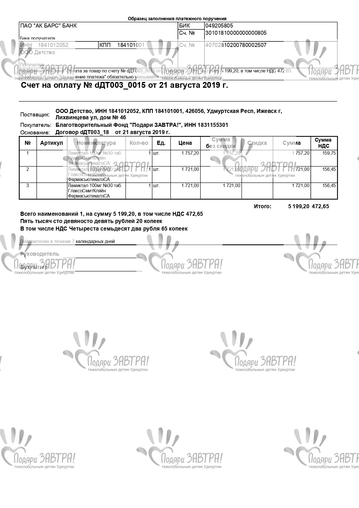 21-08-2019 Счет на оплату «Ламиктал» (5 199 руб. 20 коп.) Подробнее>>>