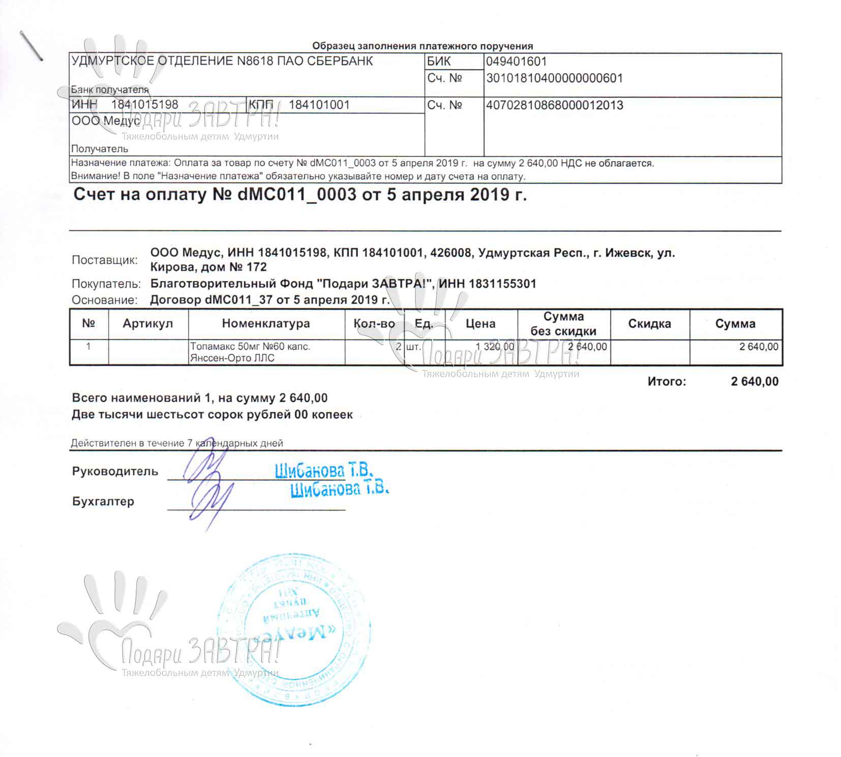 05-04-2019 Счет на оплату за препарат «Топамакс» (2 640 руб.) Подробнее>>>