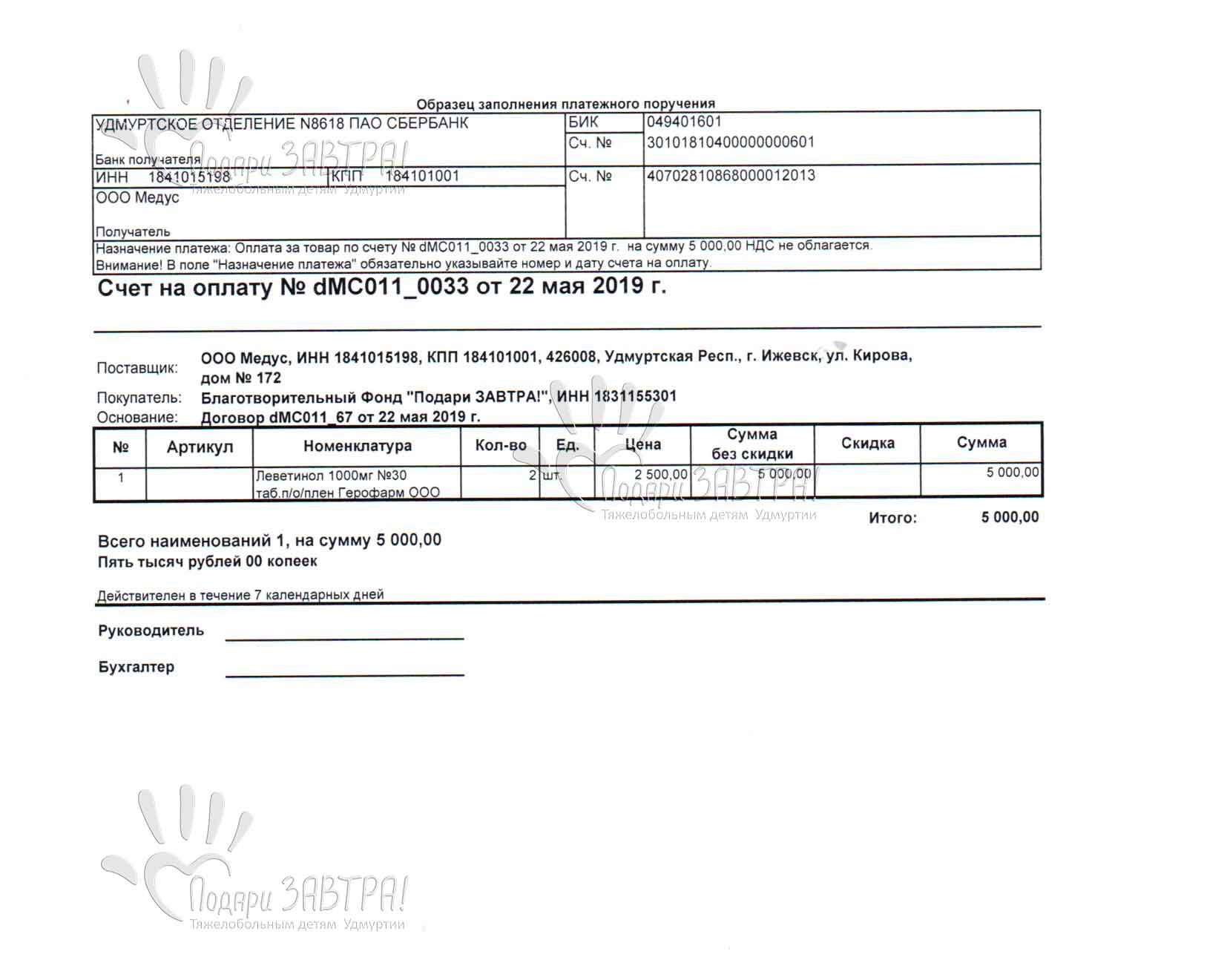 22-05-2019 Счет на оплату за «Леветинол» (5 000 руб.) Подробнее>>>