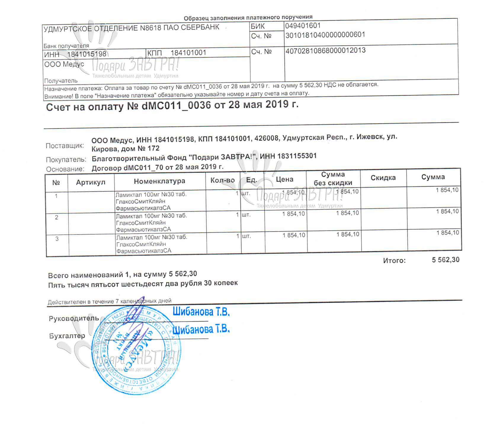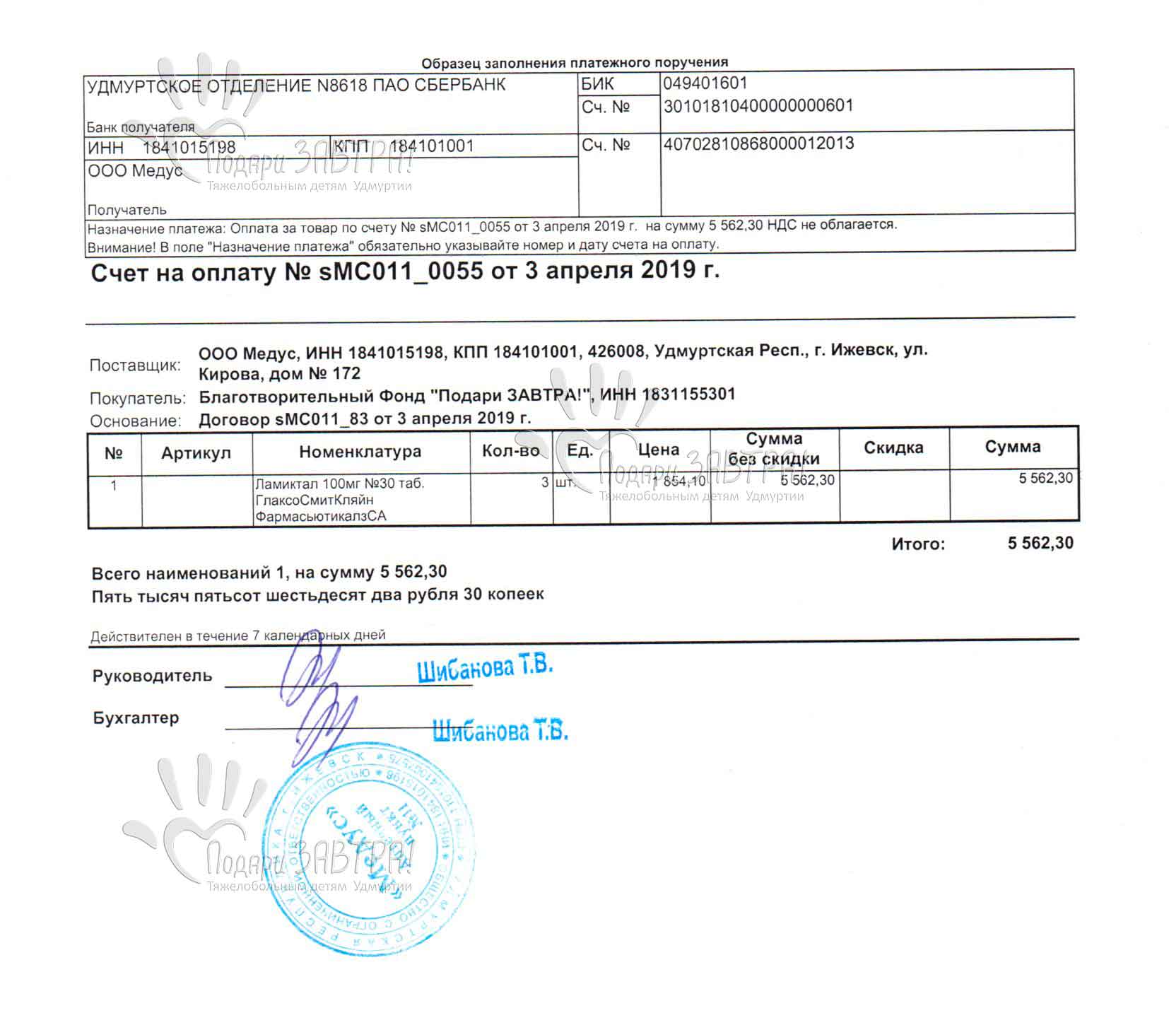 03-04-2019 Счет на оплату за препарат «Ламиктал» (5 562 руб. 30 коп) Подробнее>>>