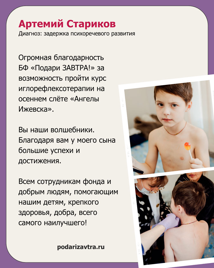 Артемий СтариковВозраст: 7 лет Город: г. Ижевск Диагноз: ЗПРР, ЦНС Цель: Оплата занятий в центре развития речи Сумма сбора: 150 тысяч рублей в год Артемий – маленький борец, которому нужна поддержка! Артемий – второй ребёнок в семье, долгожданный и любимый. Он появился на свет на 37-й неделе беременности, но рождение оказалось непростым – сильнейшая гипоксия, проблемы по неврологии, гидроцефалия, увеличение желудочков мозга. Сразу после роддома малыша перевели в больницу, где он провел первые шесть месяцев жизни. Первая тревога. В младенчестве Артемий хорошо развивался, особенно физически, проходил курсы массажа, парафинотерапии. Но после года мама начала замечать, что что-то идёт не так: