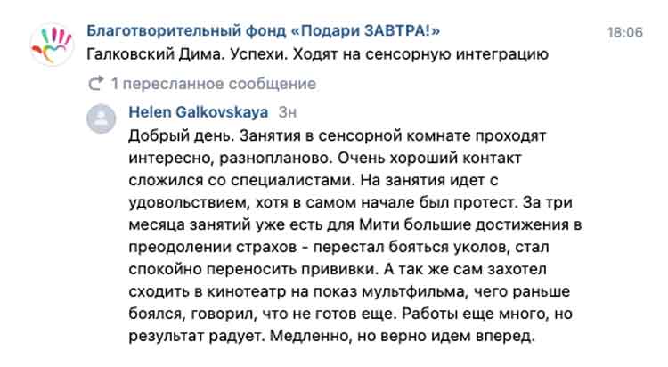 Дима ГалковскийВозраст: 7 лет Город: г. Ижевск Диагноз: Cиндром Аспергера Цель: Оплата занятий в центре развития речи Сумма сбора: 150 тысяч рублей в год 11-12-2025 Счет на оплату за курс занятий по сенсорной интеграции (13 500 руб.) Подробнее>>> 07-10-2025 Оплата за сенсорную интеграцию (10 800 руб.) Подробнее>>> 30-09-2025 Счет на оплату за курс занятий по сенсорной интеграции (10 800 руб.) Подробнее>>> 18-08-2025 Оплата за сенсорную интеграцию (10 800 руб.) Подробнее>>> 11-08-2025 Оплата за коррекционные занятия по развитию речи (13 000 руб.) Подробнее>>> 06-08-2025 Счет на оплату за курс занятий по сенсорной интеграции (10 800 руб.) Подробнее>>> 14-07-2025 Оплата за коррекционные занятия по развитию речи (12 000 руб.) Подробнее>>> 14-07-2025 Счет на оплату за коррекционные занятия по развитию речи (12 000 руб.) Подробнее >>> 12-02-2025 Оплата за коррекционные занятия по развитию речи (18 000 руб.) Подробнее >>> 12-02-2025 Счет на оплату за коррекционные занятия по развитию речи (18 000 руб.) Подробнее>>> 15-01-2025 Оплата за коррекционные занятия по развитию речи (18 000 руб.) Подробнее >>> 14-01-2025 Счет на оплату за коррекционные занятия по развитию речи (18 000 руб.) Подробнее>>> 07-01-2025 Открыт сбор для Димы Галковского. Когда родители Димы заметили, что у него задерживается речь и он не идёт на контакт с другими детьми, они начали искать ответы. После обследований врачи поставили диагноз – синдром Аспергера. Это расстройство влияет на социализацию и развитие речи, но при правильной поддержке ребёнок может полноценно развиваться и раскрывать свои таланты. С первых же занятий со специалистами появились положительные изменения: нейропсихолог, адаптивная физическая культура (АФК), занятия в бассейне, логопед – всё это помогло Диме начать говорить, улучшить координацию и взаимодействие с миром. Родители с радостью слушали его первые фразы и вопросы. Сейчас он уже может поддерживать диалог, с интересом познаёт новое и с удовольствием занимается. Дима – очень любознательный мальчик. Специалисты говорят, что у него есть все шансы на успешное развитие, но для этого важно продолжать занятия. Однако все они платные, а в семье работает только отец, поэтому сейчас продолжать в том же ритме становится сложно. На данный момент Дима продолжает посещать АФК, бассейн и логопеда. Но этого недостаточно – для полноценного развития ему нужна сенсорная интеграция и нейропсихологическая коррекция. Важно поддерживать динамику, ведь перерывы в занятиях могут затормозить достигнутый прогресс. Особенно хорошо на него влияет бассейн – он стал увереннее двигаться, лучше контролировать своё тело, а самое главное – чувствует себя счастливым. Ваша поддержка поможет ему сделать важные шаги к здоровому и счастливому будущему. Каждое пожертвование – это не просто помощь, это вера в будущее Димы. Это шанс для него говорить, дружить, чувствовать себя частью этого мира. Вместе мы можем подарить ему счастливое и полноценное детство. Давайте подарим Диме здоровое и счастливое ЗАВТРА! Медицинские документы