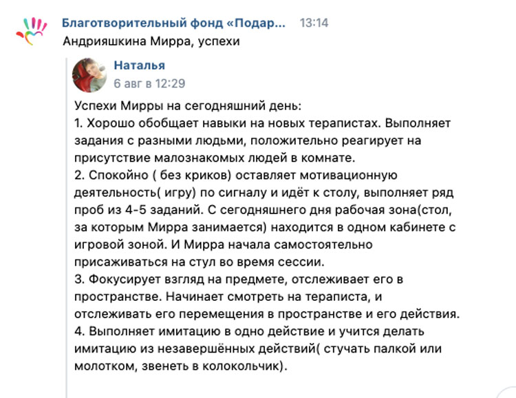 Простыми словами: секвенирование экзома — это шанс найти «ключ» к здоровью Мирры. Без него реабилитация похожа на движение вслепую, а с ним врачи смогут направить усилия в нужное русло.Мирра очень старается. Она любит занятия, любит мир вокруг и явно хочет быть ближе к людям. Но чтобы девочка смогла снова сказать «мама» и «папа», ей нужна точная медицинская помощь. Семья делает всё возможное, но оплатить дорогостоящий анализ и курсы реабилитации самостоятельно они не могут. Давайте вместе подарим Мирре шанс на здоровое и счастливое будущее! Каждый ваш рубль — это шаг к тому, чтобы девочка заговорила, смогла учиться, играть с детьми и радоваться жизни. Поделитесь этой историей, расскажите друзьям и поддержите Мирру. Вместе мы сможем подарить ей самое важное — возможность быть услышанной. Давайте подарим Мирре здоровое и счастливое ЗАВТРА! Медицинские документы