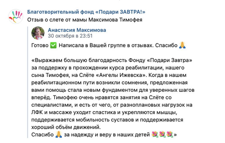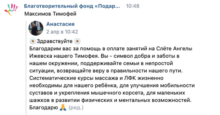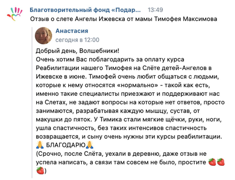 Тима МаксимовВозраст: 15 лет Город: с. Завьялово Диагноз: Рецидуально-органическое поражение ЦНС, ДЦП, ЗПМР, эпилепсия, врожденный порок развития головного мозга, тетрапарез, гиепркинезы Цель: Оплата реабилитации на слёте «Ангелы Ижевска» Сумма сбора: 50 тысяч рублей 25-10-2024 Оплата за курс массажа и ЛФК (40 000 руб.) Подробнее>>> 29-03-2024 Оплата за курс ЛФК (20 000 руб.) Подробнее >>> 29-03-2024 Оплата за курс массажа (20 000 руб.) Подробнее >>> 29-03-2023 Акт за оказание помощи: курс массажа и ЛФК на слете «Дети ангелы» Подробнее>>> 29-03-2023 Оплата за курс массажа и ЛФК (40 000 руб.) Подробнее >>> 21-06-2022 Оплата за курс массажа (39 600 руб.) Подробнее>>> 01-06-2022 Акт за оказание помощи: массаж, ЛФК Подробнее>>> 06-08-2019 Оплачены реабилитационные мероприятия на летнем слете «Дети-Ангелы». Тимофей прошел курс ЛФК (лечено-физкультурный комплекс), массажа и курс занятий с логопедом. Подробнее>> 07-06-2019 Начат сбор средств на реабилитацию Тимофея на летнем слёте «Дети-Ангелы» Тимофей - жизнерадостный улыбчивый мальчик, живущий в любящей заботливой семье с мамой, папой и двумя братишками. Родившись на 34 недели он был здоров, но очень слаб. Чтобы окрепнуть, сразу после рождения, понадобилось полтора месяца больничных процедур: в реанимации, в отделении патологии новорожденных и недоношенных РДКБ г.Ижевска. Дальше - обычная жизнь обычного ребенка: расти, развиваться, догнать сверстников, но этого не получалось... После первых прививок полиомиелита и гепатита в пол года, начались странности: стали косить глаза, Тима перестал держать голову, бросил попытки ползать; после второй прививки начались приступы, общая мышечная слабость. Страх и растерянность поселились в семье. Ребенок, который, по словам врачей, ''скоро догонит'', теперь был на противосудорожных препаратах, лежал и заразительная улыбка исчезла! Лечение не помогало, ремиссии не было, препаратов становилось больше они постоянно менялись. Тимоша мог не спать сутками, потом наоборот - спать весь день, его приходилось будить, чтобы хоть накормить, двигательная активность угасла, глаза были затуманены - он то плакал, то истерически смеялся. Все реабилитационные мероприятия категорически запретили. Т.к. результаты МРТ были со сложными изменениями, федеральные лечебные учреждения не брали на обследование, тем более на лечение. Для исключения генетической патологии, мальчику получилось попасть на консультацию в ФГБУ «Медико-генетический научный центр РАМН» в мае 2013 года. После длительных просьб и очередей, Тимофея взяли на обследование в ФГБУ «Московский Научно-исследовательский институт педиатрии и детской хирургии Минздрава России» (Отделение психоневрологии и эпилептологии) в ноябре 2013 г., где специалисты по ЭЭГ предположили, что эпиактивности нет, но лечение не подкорректировали, т.к. приступы не останавливались. Только осенью 2015 года специалистами Психолого-неврологического центра Д. Е. Зайцева Санкт-Петербурга было подтверждено предположение: эпилепсии нет и не было, приступы - разновидность гиперкинезов. Врачи ошиблись! После отмены противосудорожных препаратов к Тимофею вернулась его очаровательная улыбка, наладился сон, появился интерес к окружающему миру. Сейчас Тимочка плохо держит голову, не умеет сам сидеть, редко переворачивается со спины на живот и обратно, не может говорить, но умеет губами показывать некоторые буквы. Тима