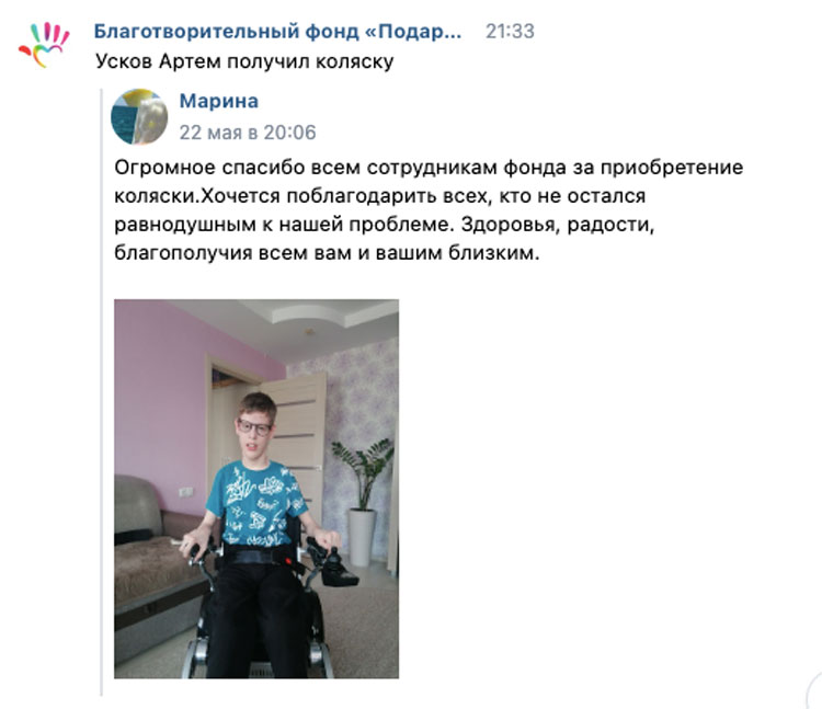 Артем УсковВозраст: 18 лет Город: г. Игра Диагноз: ДЦП, спастический тетрапарез Оплачено: 272 500 рублей Артем родился недоношенным, 29 недель. В 11 месяцев ему поставили диагноз ДЦП. Сейчас Артему 12 лет, он не ходит, ползает только по-пластунски, сидит не уверенно, но не смотря на все это он очень улыбчивый и общительный мальчик. Мой сын обучается на дому, очень любит ручной труд и окружающий мирю С увлечением смотрит каналы про животных и рыбалку. Артему нравятся прогулки по лесу, мечтает съездить на речку, чтобы порыбачить с лодки. Ему многое интересно, но из-за состояния здоровья не все получается. Медицинские документы