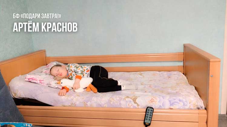 Артём КрасновВозраст: 5 лет Город: г. Ижевск Диагноз: GM2 ганглиозидоз, смешанный тетрапарез Оплачено: 114 400 рублей 16-04-2025 Оплата за кровать детскую функциональную медицинскую, матрас противопролежневый медиц (114 400 руб.) Подробнее>>> 12-03-2025 Счет на оплату за медицинскую кровать (114 400 руб.) Подробнее>>> Артём чувствует любовь, даже если не может сказать об этом! Артём не может говорить, но он понимает, когда мама рядом. Он замирает, слушая её голос, и, кажется, в эти моменты становится спокойнее. Он любит музыкальные игрушки, обожает, когда ему делают массаж ног и спины, и особенно — когда с ним разговаривают. Ему важно слышать знакомые голоса, чувствовать тепло рук. Родные делают всё, чтобы он чувствовал себя хорошо. Но болезнь делает даже простые вещи тяжёлыми. Как изменилась жизнь Артёма? Когда-то он ползал, сам ел, держал игрушки, ходил, держась за мамину руку. Всё шло как у обычных детей. Но в полтора года родители заметили, что он стал слабее: хуже сидел, не тянулся за игрушками. Через пару месяцев перестал ползать, почти не двигался. Родители искали причину, проходили обследования. Ответ нашёлся только спустя пять месяцев — ганглиозидоз. Это редкое генетическое заболевание, при котором организм не может выводить вредные вещества, они накапливаются в клетках мозга и мешают двигаться, видеть, слышать и даже дышать. Сейчас Артёму нужна особая забота. Из-за болезни он не может жевать и глотать обычную пищу. У него скапливается мокрота и слизь, а сил откашлять их нет. Иногда он просто задыхается. Судороги, слабость, постоянная усталость… Но он продолжает бороться.И в этой борьбе ему очень нужна медицинская кровать. Почему это так важно? Специальная кровать поможет Артёму: