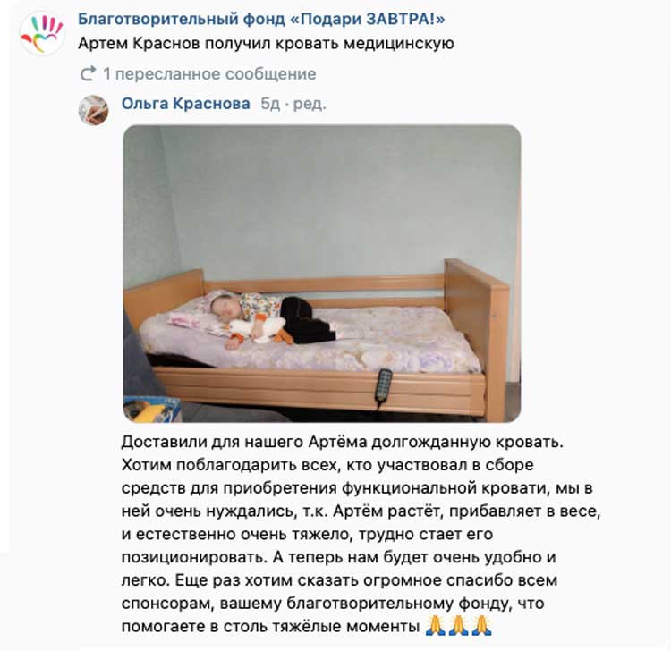 Это не просто кровать, а возможность сделать жизнь Артёма комфортнее, помочь ему легче дышать и чувствовать себя лучше. Родные очень надеются на вашу помощь. Давайте подарим Артёму здоровое и счастливое ЗАВТРА! Медицинские документы
