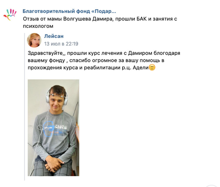 Дамир ВолгушевВозраст: 21 год Город: г. Ижевск Диагноз: Детский аутизм Оплачено: 42 900 рублей 31-05-2023 Оплата за прием врача невролога, психолога (28 300 руб.) Подробнее>>> 20-03-2023 Счет на оплату реабилитации в РЦ «Адели» (28 300 руб.) Подробнее >>> 27-07-2022 Успехи Дамира Подробнее >>> 06-05-2022 Оплата за прием врача-невролога, консультация и занятие психолога, биоакустическая коррекция (13 200 руб.) Подробнее >>> 08-02-2022 Счёт на оплату реабилитации в РЦ «Адели» (13 200 руб.) Подробнее>>> 30-10-2020 Оплата за индивидуальные занятия (1 400 руб.) Подробнее >>> 27-03-2018 Начат сбор средств для реабилитации в барокамере. Дамир с рождения наблюдался неврологом с диагнозом – энцефалопатия, РОП, ЦНС. Посещал коррекционный детский сад сторонился детей, уединялся в раздевалке или в спальне. В шесть лет ему поставили диагноз – атипичный аутизм с умственной отсталостью. Сейчас Дамир учится в коррекционной школе 8 вида. В течение всего времени занимается с психологом, дефектологом, проходит курсы лечения в реабилитационном центре , проходит курсы лечения у остеопата, микрополяризацию, томатис. На все наши старания, лечения, занятия на сегодня Дамир не общается со сверстниками, требует постоянного сопровождения, плохо ориентируется в пространстве, задержка речевого развития, в речи эхололия, слабый иммунитет: часто болел пневмонией , бронхитами. Очень хотим попробовать курс реабилитации барокамерой. Медицинские документы