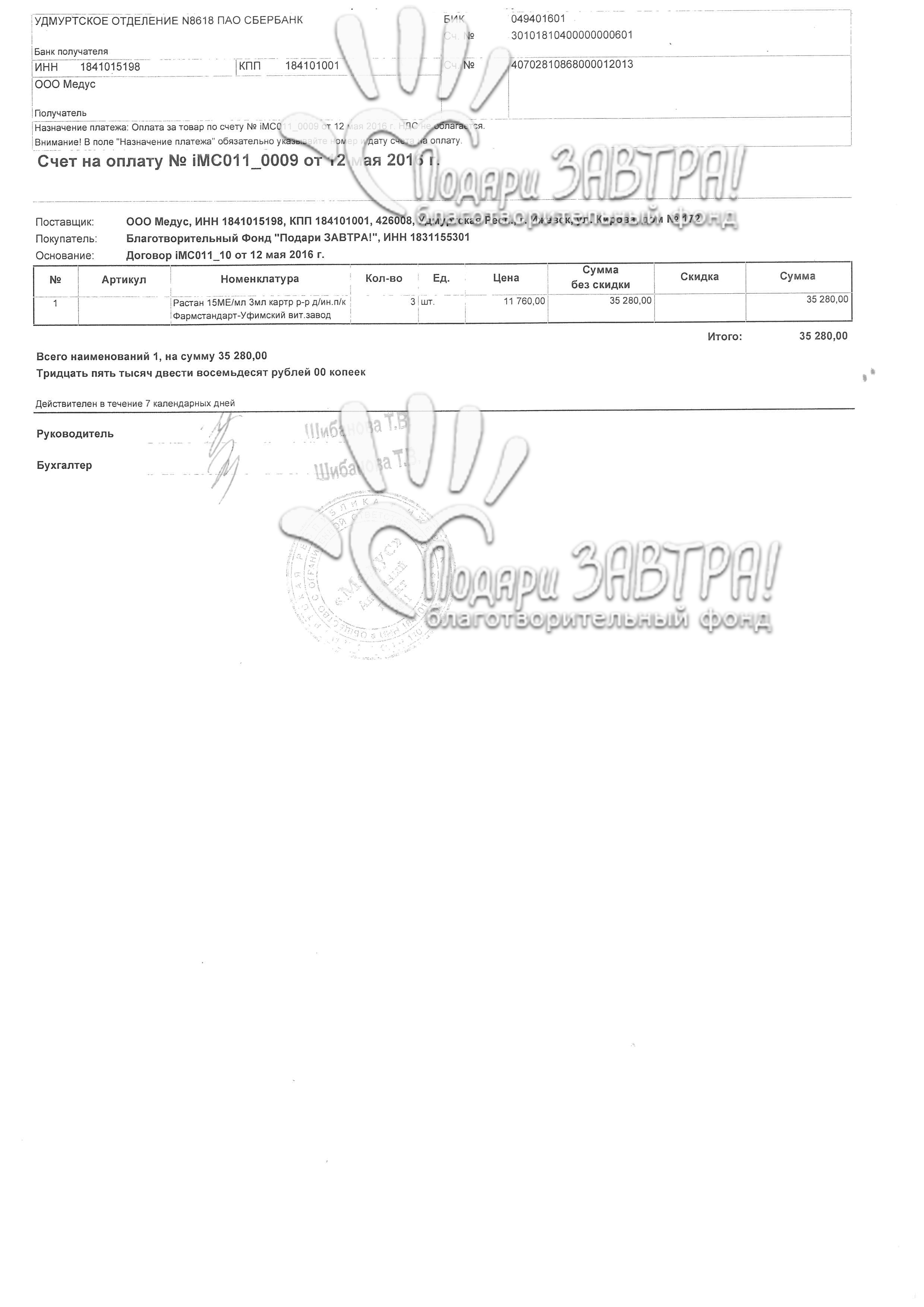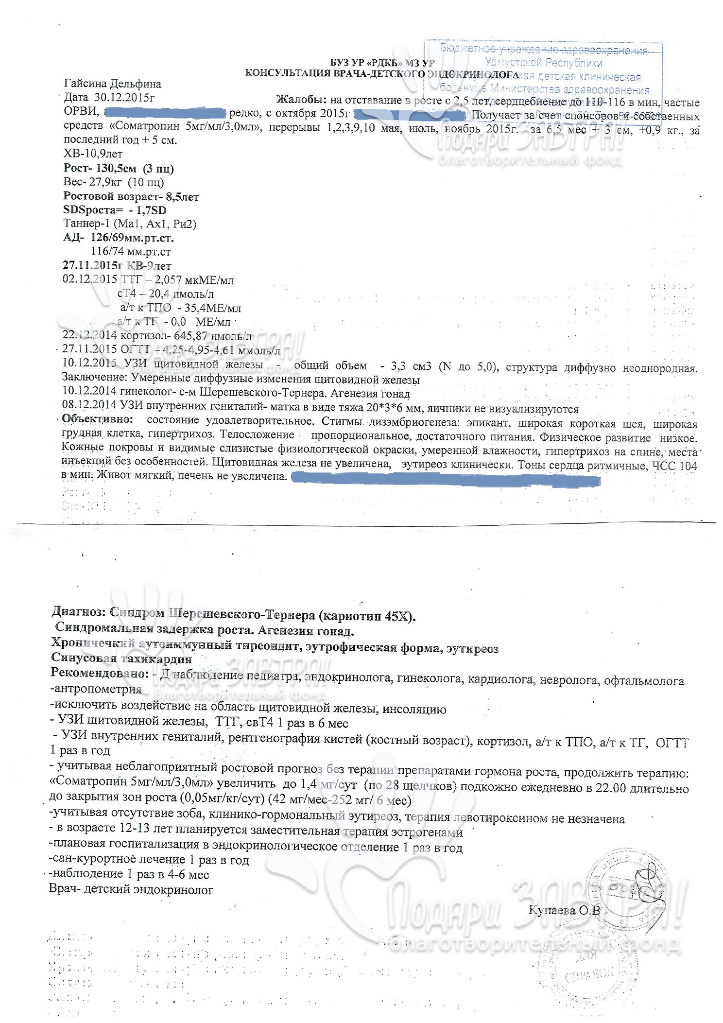 Дельфина ГайсинаВозраст: 21 год Город: г. Ижевск Диагноз: Синдром Шерешевского-Тернера Оплачено: 431 520 руб Дельфина - очень отзывчивая и контактная девочка, увлекается танцами, музыкой, вокалом, выступлением на сцене. Она поставила диагноз Синдром Шерешевского-Тернера и назначил лечение гормоном «Растан». Данный препарат стимулирует рост массы и регулирует белковый обмен. Сейчас девочке 11 лет, ее рост всего 130 см. Без гормональной терапии она не только останется внутренним органом, но и станет доступной для детей. Лечение очень дорогостоящее, около 500 тыс.руб. не хватает средств для его оплаты. Поможем Дельфине обрести счастливое ЗАВТРА! Медицинские документы