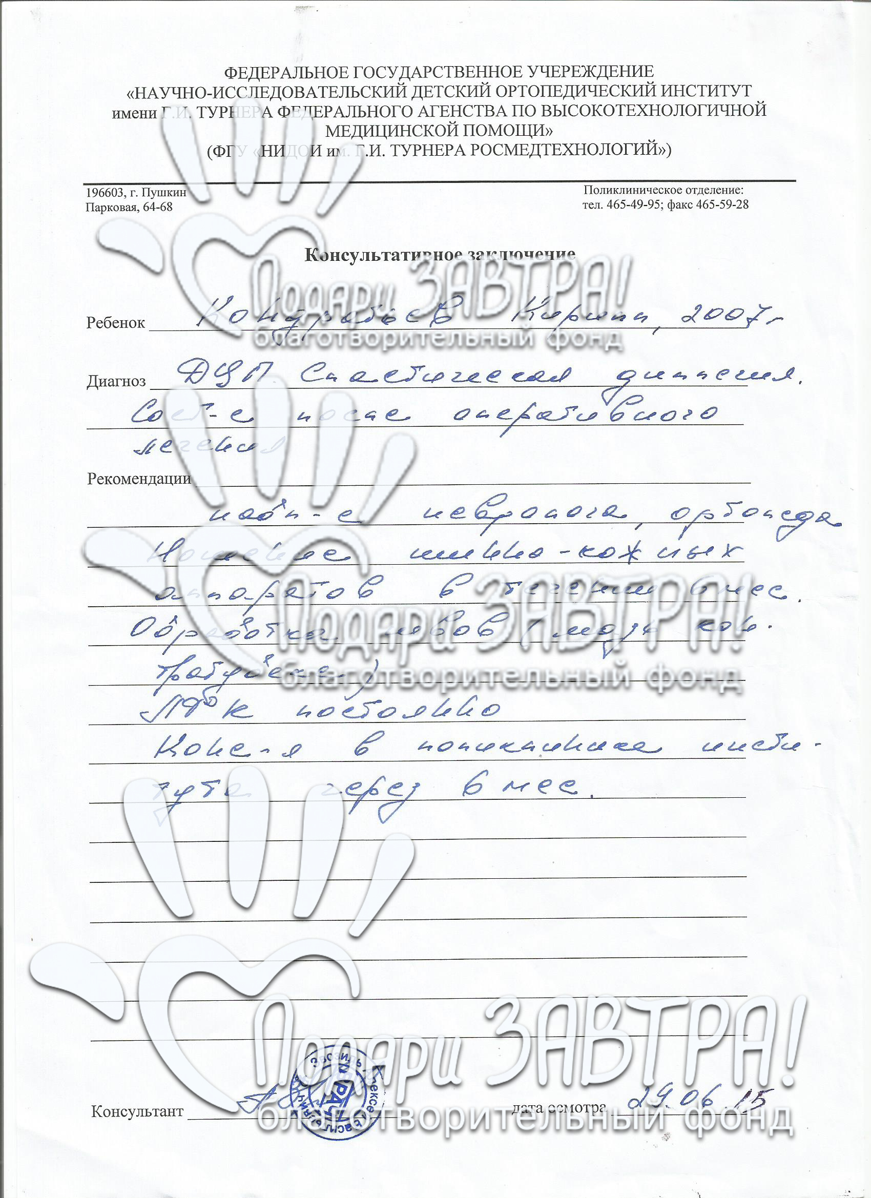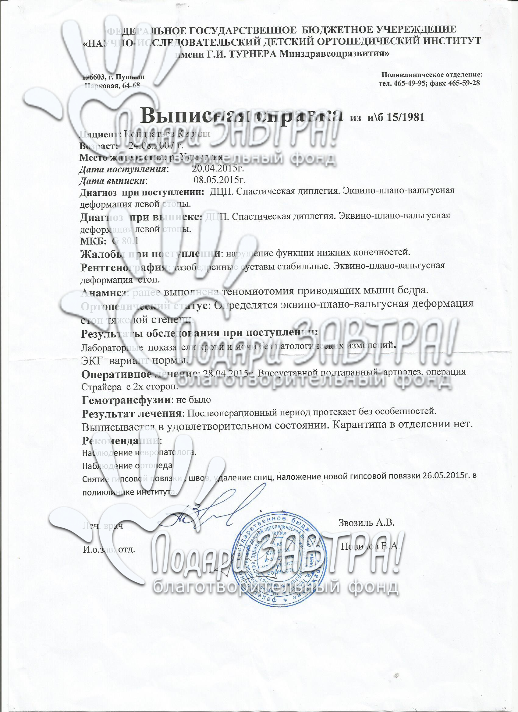 Кирилл КондратьевВозраст: 18 лет Город: г. Ижевск Диагноз: ДЦП, стастическая диплегия, множественные контрактуры суставов нижних конечностей Оплачено: 152 148 руб. 12-08-2016 Оплачены страховые взносы за реабилитацию на слете «Дети-ангелы» (3 864 руб.) Подробнее>>> 08-07-2016 Кириллу оплачена реабилитации на слете «Дети-Ангелы» (40 000 руб.) Подробнее>>> 04-07-2016 Оплата за лечение (21 600 руб.) Подробнее>>> 04-07-2016 Оплата НДФЛ (13 395 руб. 20 коп.) Подробнее>>> 04-07-2016 Оплата за конвульсивные услуги (32 020 руб.) Подробнее>>> 04-07-2016 Оплата за конвульсивные услуги (38 424 руб.) Подробнее>>> 28-06-2016 Оплата НДФЛ (3 348 руб.) Подробнее>>> 27-06-2016 Оплата за конвульсивные услуги (8 600 руб.) Подробнее>>> 27-06-2016 Оплата за конвульсивные услуги (9 600 руб.) Подробнее>>> 03-06-2016 Счет на оплату медицинских услуг (21 600 руб.) Подробнее>>> 23-05-2016 Открыт сбор для Кирилла Кондратьева. Кирилл один из двойни. Детки родились очень рано, в 28 недель, ростом до 39 см, весом до 1270 гр. В реанимации малыши пробыли 2,5 недели, а затем были переведены в отделение для недоношенных детей. Только спустя 3 месяца их выписали из больницы. В год и 3 месяца Кириллу дали инвалидность с диагнозом ДЦП. С 7 месяцев он стал постоянным пациентом детского психоневрологического диспансера «Нейрон» г. Ижевск и с 3 лет – Реабилитационного центра. В 2013 году мальчику было сделано 4 операции на ножки в институте им. Турнера, г. Санкт-Петербург, и в 2015 году там же была проведена сложная операция на стопы, после которой он должен был постоянно ходить в шинокожанных аппаратах в течении 6 месяцев. В 2014 и 2015 году Кириллу удалось посетить десятидневные курсы слета «Дети-Ангелы», где с каждым ребенком занимаются индивидуально. После прохождения курсов видна положительная динамика, мальчик стал лучше двигаться. Специалисты говорят, что у него есть все шансы встать на ноги и научиться ходить самостоятельно. Кирилл мечтает самостоятельно спуститься по лесенкам в подъезде и побегать во дворе с другими детьми. Поможем Кириллу встать на ножки! Медицинские документы