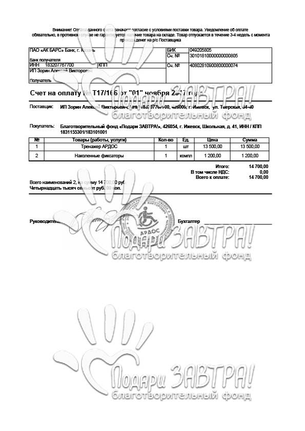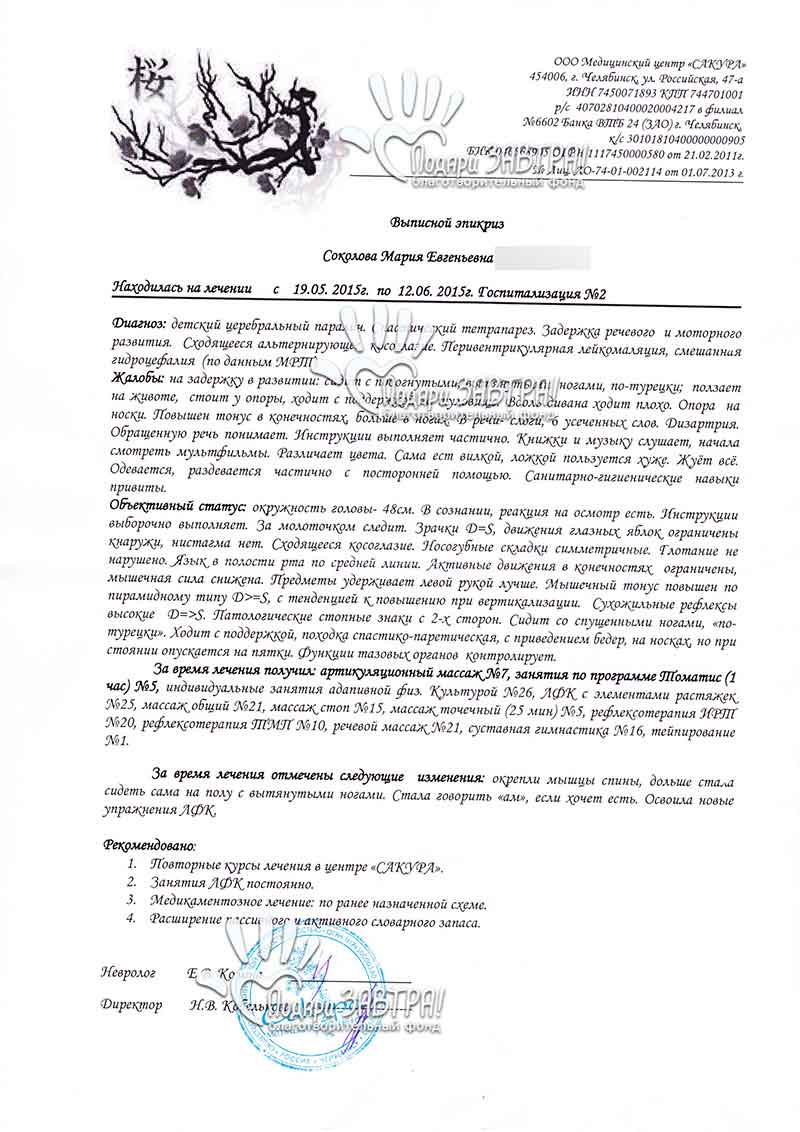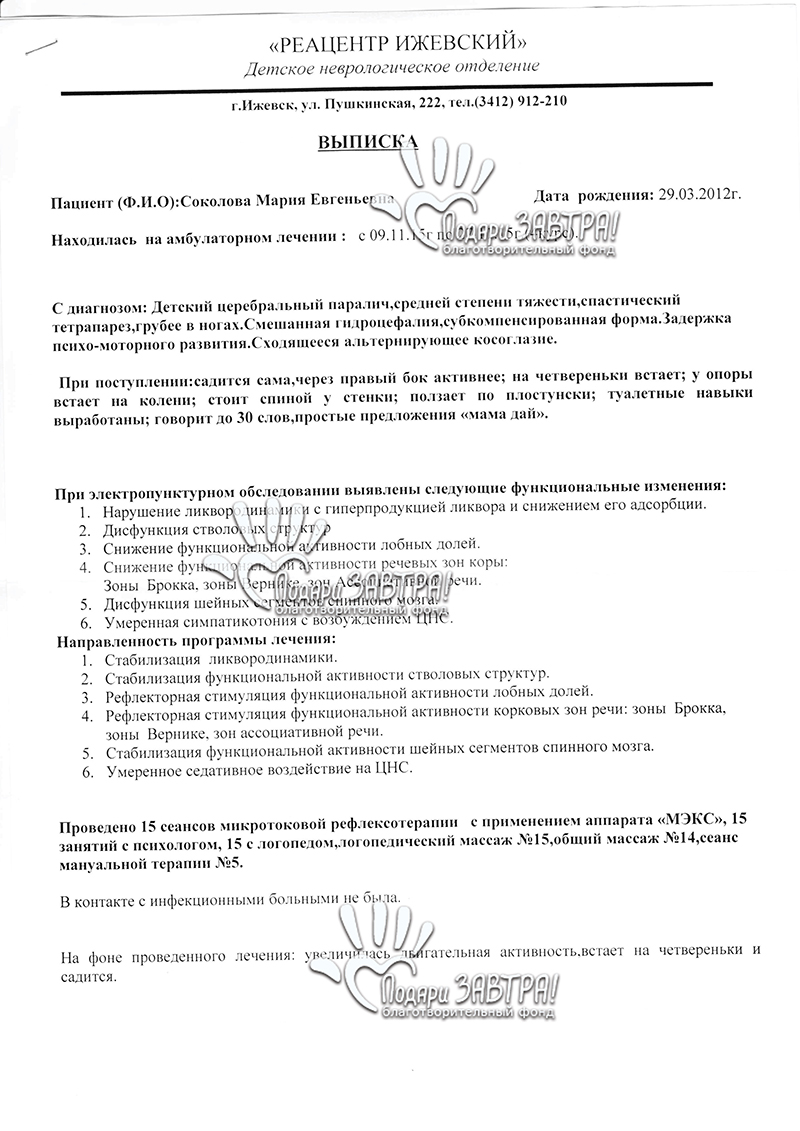 Маша СоколоваВозраст: 13 лет Город: г. Глазов Диагноз: ДЦП, спастическая диплегия Оплачено: 153 300 руб. 09-11-2017 Оплачен тренажер - вертикализатор «АРДОС» (14 700 руб.) Подробнее>>> 01-11-2017 Начат сбор для Маши Соколовой. Цель сбора - покупка тренажера-вертикализатора «АРДОС». 21-08-2017 Оплачен курс массажа для Маши Соколовой (8 000 руб.) Подробнее>>> 21-08-2017 Счет на оплату за тренажер АРДОС (14 7000 руб.) Подробнее>>> 11-08-2017 Открыт сбор для Маши Соколовой. 25-07-2016 Машеньке сейчас 4 года. Она с удовольствием складывает паззлы и рисует, с любознательностью и интересом относится ко всему новому. Девочка сама садится, встает на четвереньки, у опоры встает на колени, стоит спиной у стенки, ползает по-пластунски, говорит до 30 слов и составляет простые предложения. Благодаря нашим общим стараниям Машенька прошла курс реабилитации в медицинском центре «Сакура». Девочка занималась адапивной физкультурой и суставной гимнастикой, а также посещала курсы массажа, рефлексотерапии и ЛФК. За время лечения отмечены следующие результаты: у девочки окрепли мышцы спины, она дольше стала сидеть на полу с вытянутыми ногами. Лечение девочки необходимо продолжать, для того, чтобы закрепить полученные результаты и достичь новых. Она нуждается в очередной реабилитации. Вместе мы сможем подарить Марии счастливое ЗАВТРА! 03-12-2014 Оплачена реабилитация Марии Соколовой. Подробнее>>> 01-11-2014 Начат сбор для Марии Соколовой. Подробнее>>> 27-10-2014 Счет на оплату реабилитации в РЦ «Сакура» (130 600 руб.) Подробнее>>> На 38 неделе беременности путем кесарева сечения на свет появилась Мария. Вес при рождении составлял 2600 грамм. Беременность мамы протекала тяжело, многоводие, гипоксия плода, ребенок внутри почти не развивался. Позже Маше поставили диагноз ДЦП. В три месяца появилось косоглазие, головку не держала. Несмотря на уверения врачей, что это небольшая задержка в развитии и все исправится, мама с четырех месяцев начала заниматься лечением дочери: массаж, физкультура, физиопроцедуры, бассейн. Маша регулярно проходила реабилитацию в детских больницах, центре «Нейрон», Российском реабилитационном центре «Детство» (г. Москва), Реацентре г. Ижевска. Лечение дает небольшие результаты. В год Маша научилась ползать по-пластунски, пытается садиться, различать цвета. Маме приходится очень тяжело, отец Маши, узнав, что ребенок болен, ушел из семьи и помощи не оказывает. Приходится выживать на одну пенсию по инвалидности. Но мама не сдается, и хочет сделать все возможное для того, чтобы Маша смогла жить полноценно. Помогите Марии пройти реабилитацию в медицинском центре «Сакура» (г. Челябинск). Центр специализируется на реабилитации детей с ДЦП. Детям помогают квалифицированные специалисты: врачи, массажисты, реабилитологи. Центр оснащен всем необходимым диагностическим и реабилитационным оборудованием. Вместе мы сможем подарить Марии счастливое ЗАВТРА! Подтверждающие документы