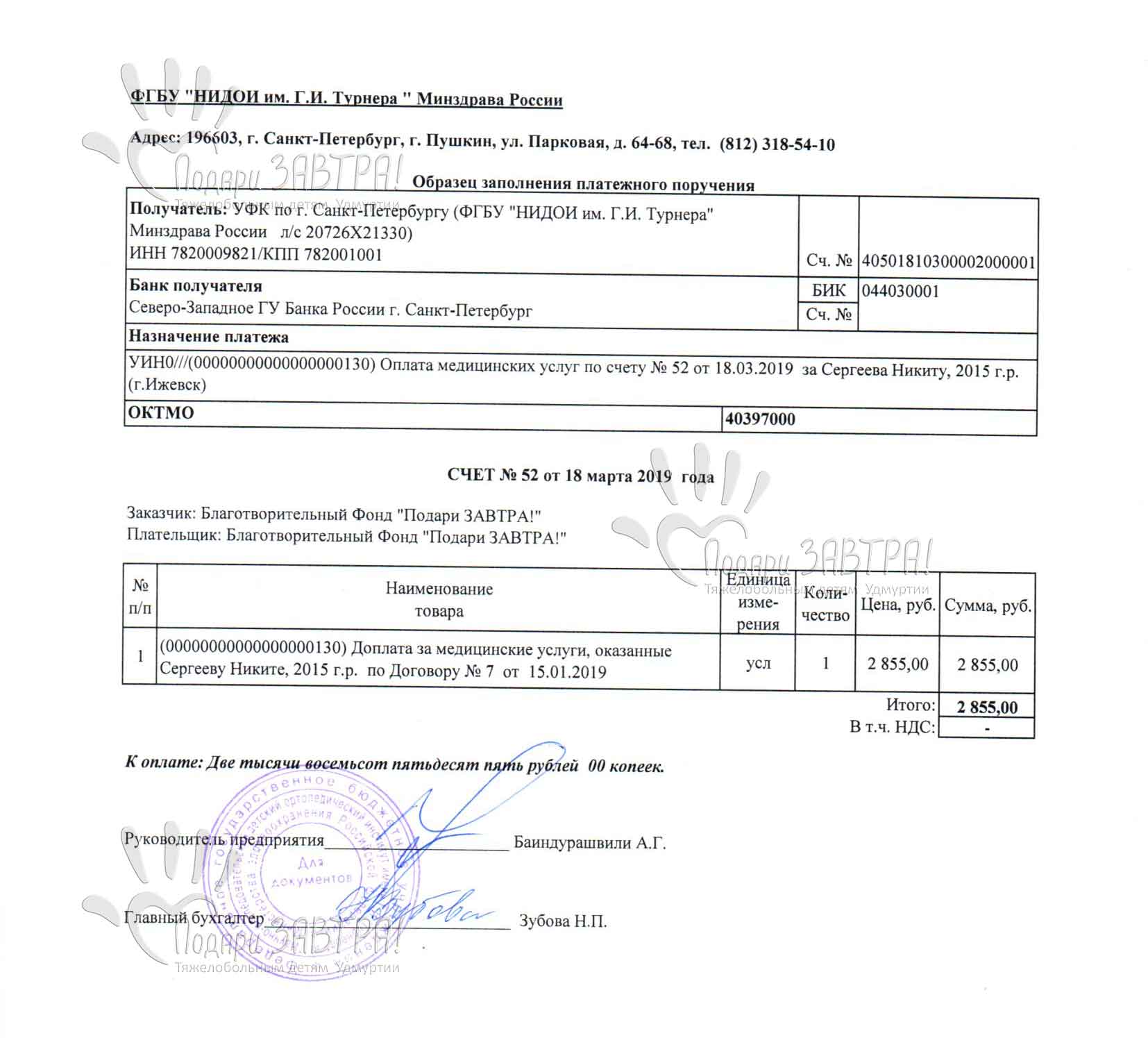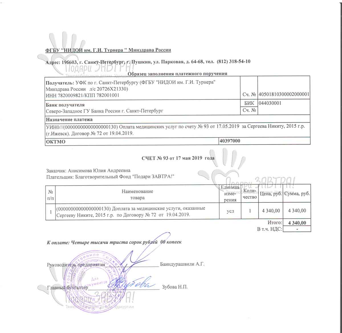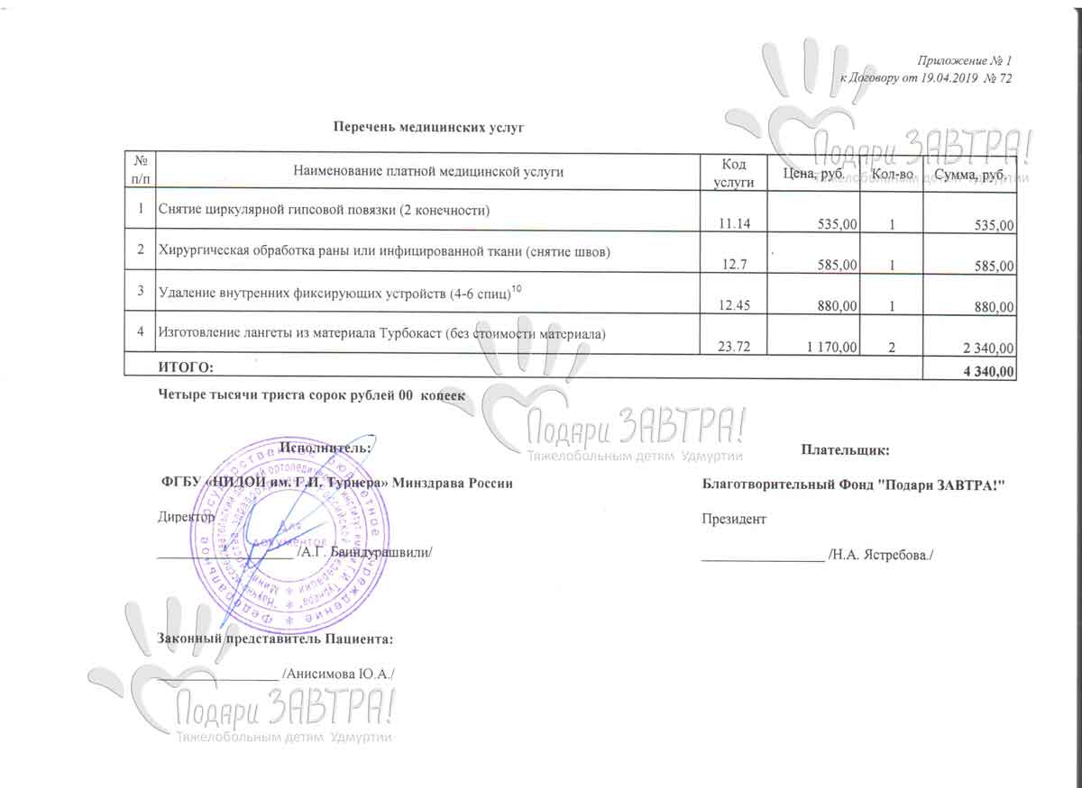 Никита СергеевВозраст: 10 лет Город: г. Ижевск Диагноз: Врожденная двусторонняя косолапость Оплачено: 28 394 руб. 22-05-2019 Оплачено лечение в Институте Турнера (4 340 руб.) Подробнее >>> 21-05-2019 Приобретены летние ортопедические ботинки для Никиты (5 199 руб.) Подробнее >>> 17-05-2019 Счет на оплату медицинских услуг (4 340 руб.) Подробнее >>> 16-05-2019 Счет на оплату за ботинки летние (5 199 руб.) Подробнее >>> 11-04-2019 Доплата за медецинские услуги (2 855 руб.) Подробнее >>> 18-03-2019 Счет на оплату медицинских услуг (2 855 руб.) Подробнее >>> 21-01-2019 Внесена предоплата за гипсование Никиты (16 000 руб.) Подробнее >>> 17-01-2019 Начат сбор средств для Никиты Сергеева Подробнее >>> 15-01-2019 Счет на оплату медицинских услуг (16 000 руб.) Подробнее >>> Мама Никиты рассказывает: Беременность Никитой была запланирована, протекала хорошо. На 40-й неделе мой мальчик появился на свет и первое что меня спросили врачи: «Здоровый ли родился старший ребенок?». Я была в шоке, у Никиты стопы расположены в разные стороны. Я не могла найти себе места, куда бежать и что мне делать? После обследования у ортопеда был поставлен диагноз: врожденная двухсторонняя костная косолапость тяжелой степени и назначено лечение. В возрасте одного месяца Никите ломали ножки и в течение полугода он находился в гипсе. С того момента мы ездим по различным больницам, стараемся исправить ему ножки. Перенесли оперативное лечение, но оно оказалось не эффективным. Сейчас Никите 3 года и 4 месяца. Он очень активный, общительный мальчик. Любит бегать, прыгать, как все его сверстники. В марте 2019 года Никите предстоит операция в Научно-исследовательском детском ортопедическом институте имени Г.И. Турнера в Санкт-Петербурге. Но для этого необходимо подготовить ребенка. Произвести платное гипсование по методике Понсети, на которое у нас нет денег и поэтому просим Вас о помощи. Я верю в светлое будущее своего мальчика и каждый божий день молюсь за его здоровье… Медицинские документы