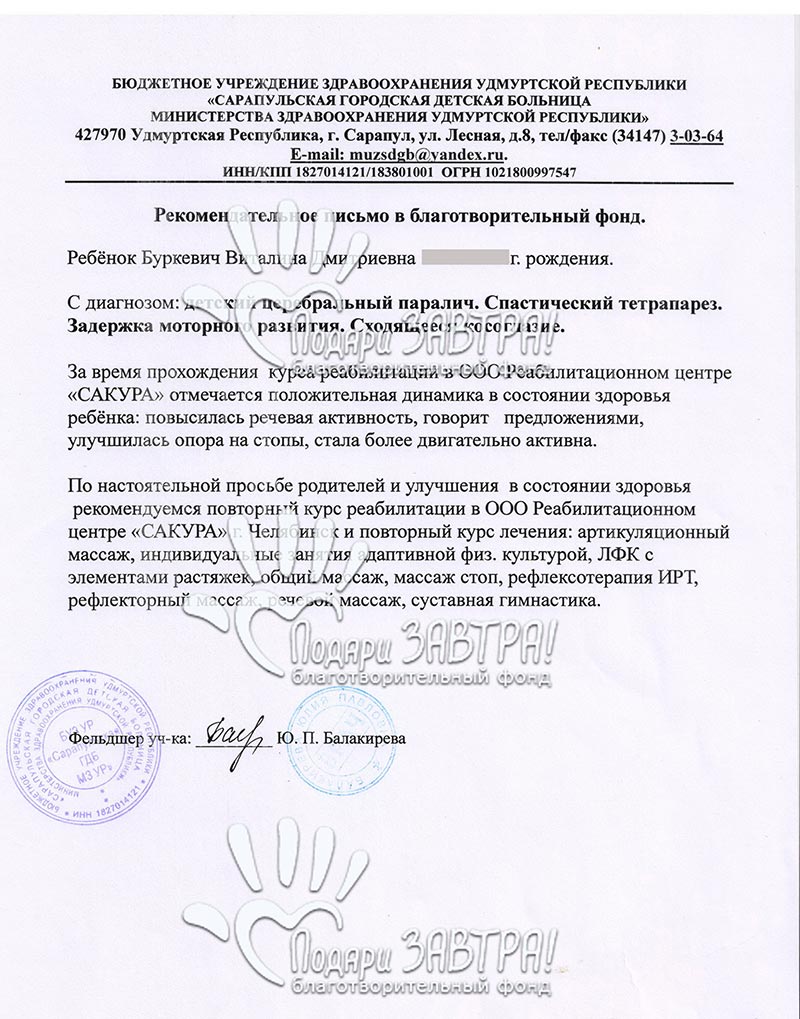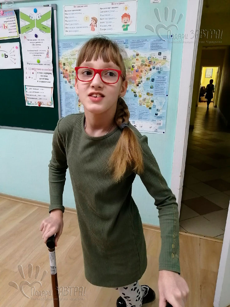 Виталина БуркевичВозраст: 13 лет Город: г. Сарапул Диагноз: ДЦП, задержка моторного развития Оплачено: 106 152 руб. 24-05-2023 Оплата за прием врача педиатра, врача ЛФК, массаж (61 100 руб.) Подробнее >>> 16-05-2023 «Я мечтаю ходить!» Подробнее >>> 20-03-2023 Счет на оплату реабилитации в РЦ «Адели» (61 100 руб.) Подробнее >>> 16-03-2020 Оплачена занятий по программе «Лыжи мечты» (2 250 руб.) Подробнее >>> 26-06-2018 Коляска оплачена (42 802 руб.) Подробнее >>> 14-05-2018 Начат сбор средств для покупки коляски. Виталина четвертый ребенок в семье, родилась недоношенной на сроке 30-31 недель, ростом 42 см. и весом 1550 гр. У девочки задержка в моторном развитии. В возрасте одного года Виталине были поставлены диагнозы : ДЦП (Детский церебральный паралич), спастический тетрапарез, задержка моторного развития, сходящееся косоглазие. И с этого момента родители девочки начали искать методы реабилитации, проводили комплексное лечение препаратами, массаж, ЛФК, лежали в местных лечебных учреждениях, проходили курс реабилитации в Казахстане, курс лечения в «Городской больнице № 8» г. Казань. Каждые 3 месяца родители возят Виталину на реабилитационные курсы, постоянно посещают остеопата, прошли 2 курса реабилитации в РЦ «Сакура» г. Челябинск — после чего Виталина начала говорить и более уверенно двигаться. Виталина очень жизнерадостная девочка, мечтает ходить ножками и кататься на роликах, но не может. На данный момент она в состоянии переворачиваться, неправильно ползать (прыгать по лягушачьи), недолго вставать у опоры на колени, сидеть в позе W. Семья старается поставить ее на ноги, вкладывая все доступные физические и материальные ресурсы, и радуется любому положительному результату. Со всеми затратами они справлялись сами, не обращаясь в благотворительные фонды, но силы уже иссякли, средств на лечение не хватает. Работает только папа, т.к. мама постоянно находится с Виталиной. Помогите Виталине обрести счастливое завтра! Медицинские документы