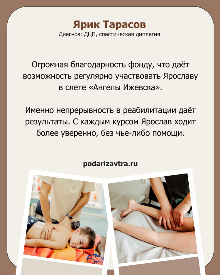 Ярик ТарасовВозраст: 10 лет Город: с. Октябрьский Диагноз: ДЦП, спастическая диплегия Оплачено: 285 400 рублей Ярослав родился на 27 неделе. Он был совсем крохой – чуть больше килограмма. Тогда малыш ещё не мог дышать сам и Ярослав провёл 42 дня в реанимации на ИВЛ. И только спустя 54 дня его перевели в отделение недоношенных. У Ярослава ретинопатия, поражение ЦНС, бронхо-легочная дисплазия (БЛД), несформированность органов. Диагнозы, которые встречаются у недоношенных детей. Домой Ярослава отправили только после тщательного наблюдения – на третьем месяце жизни. И сразу после выписки началась активная реабилитация. Уже тогда Ярослав сильно отставал в развитии от сверстников. Впервые Ярик сел в годик. Чуть позже начал стоять у опоры. А чтобы сделать первый шаг, потребовалось еще 3 года. Так в 4 года Ярик начал тихонько на носочках ходить, а стоять у опоры было трудновато. А ещё он не разговаривал. Диагноз БЛД сняли сразу после того, как у Ярика восстановилось зрение. Благодаря упорным и постоянным занятиям Ярослав научился говорить. “Постоянно занимается ЛФК дома, ходим к логопеду. Посещаем различные курсы. В том числе и слёт Дети-ангелы», – мама. В 2020 году Ярику сделали операцию в г. Курган. Благодаря этой операции, реабилитации и ежедневным занятиям Ярослав может ходить, наступать на пятку, пытается бегать, у него получается хорошо держать равновесие. Ещё Ярик ходит в детский сад, занимается в футбольной секции «Кузнечики», рисует. Сейчас у Ярослава активная пора: он растёт, учится новому. И всё это повлияет на его жизнь в будущем. Поэтому постоянная реабилитация поможет Ярику укрепить здоровье и стать сильным. Давайте подарим Ярославу счастливое ЗАВТРА! Медицинские документы