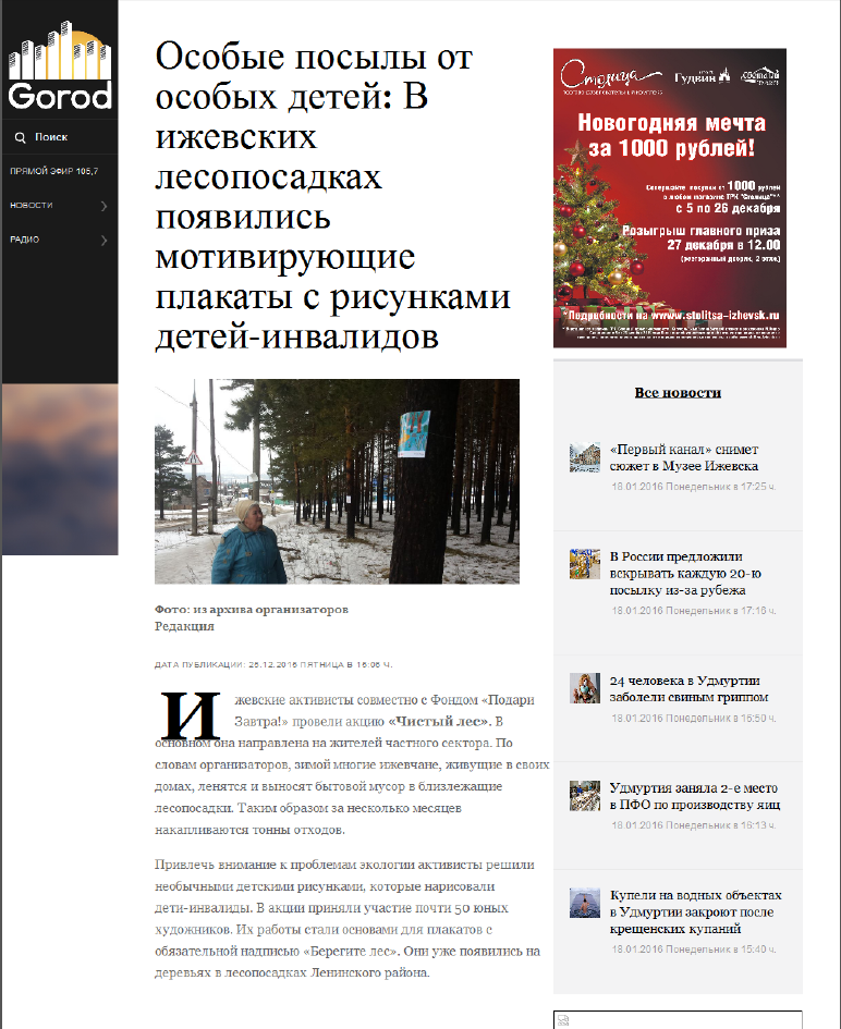На сайте Город ФМ опубликована статья: «Особые посылы от особых детей: В ижевских лесопосадках появились мотивирующие плакаты с рисунками детей-инвалидов»