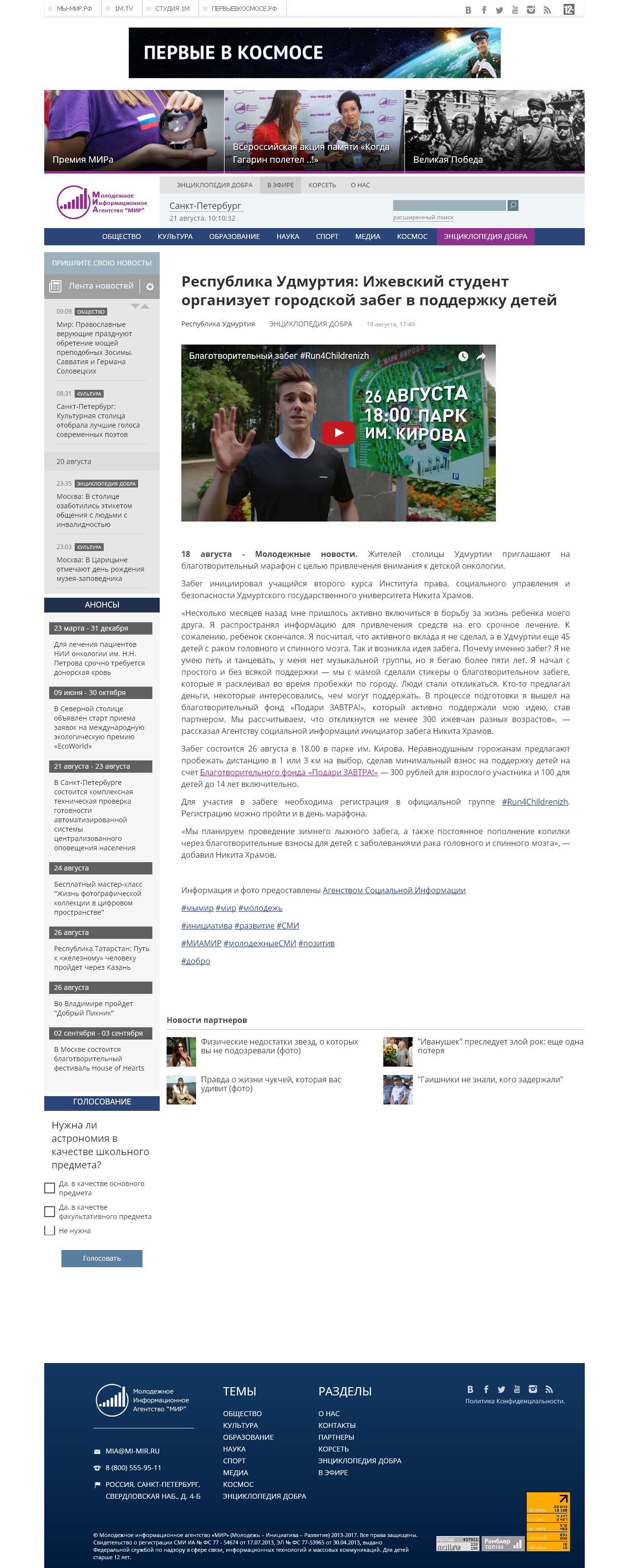 Республика Удмуртия: Ижевский студент организует городской забег в поддержку детейЖителей столицы Удмуртии приглашают на благотворительный марафон с целью привлечения внимания к детской онкологии. Забег инициировал учащийся второго курса Института права, социального управления и безопасности Удмуртского государственного университета Никита Храмов.