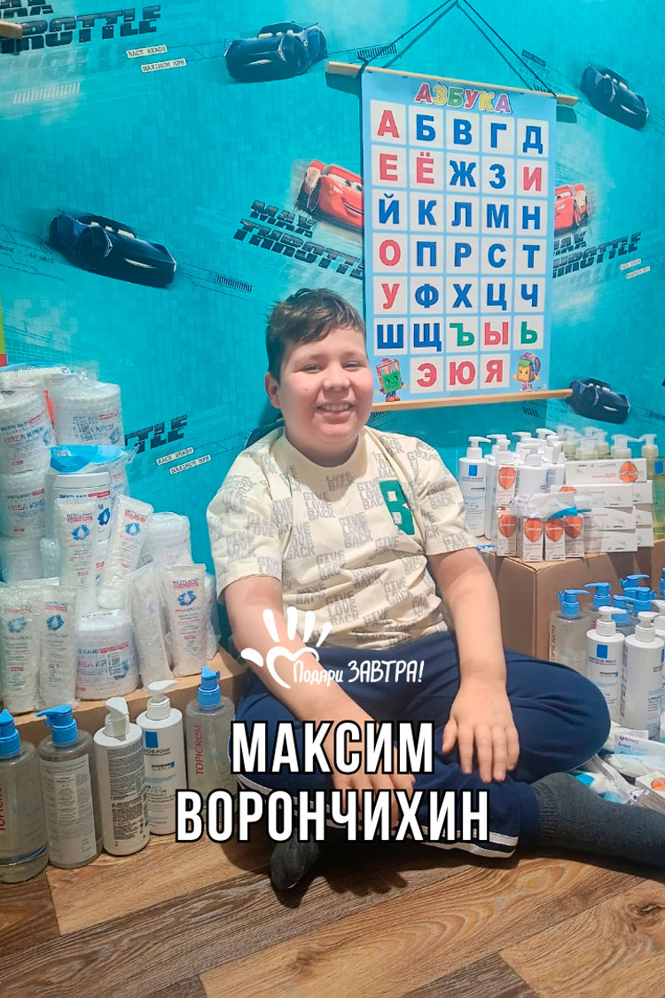 Максим ВорончихинВозраст: 10 лет Город: с. Люкшудья Диагноз: Иглистый ихтиоз Цель: Покупка кремов и мазей Сумма сбора: 239 460 рублей в год Максим родился с редким генетическим заболеванием — врождённым игольчатым ихтиозом. Это значит, что вся кожа мальчика покрыта сухими, шершавыми чешуйками. Ладошки и стопы — в трещинах. Кожа не растягивается, не эластична. Потовые и сальные железы не работают — она не может естественно увлажняться и защищаться. Без постоянного ухода простые движения причиняют боль: каждый шаг — испытание, каждое прикосновение — риск новой раны. Даже просто застегнуть пуговку или взять игрушку становится подвигом. Максим привык терпеть, но когда боль становится невыносимой — не выдерживает и плачет. Мама тогда снова берёт в руки кремы и мази — чтобы хоть немного облегчить сыну страдания. Почему уход за кожей для Максима — не косметика, а необходимость для жизни? Специальные лечебные и увлажняющие кремы, шампуни: