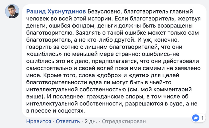 Ошибочные платежи могли возникнуть в результате непреднамеренных действий нескольких сторон. В том числе и Русфонда, который свои призывы к жертвователям формулирует так, что это вызывает ошибки. Например, использование уникального слова «русфонд» помогло бы избежать подобной ситуации с ошибочными перечислениями. Несвоевременность действий Сбербанка по обработке нашего запроса на приостановку слов также сыграла свою роль. Но, в первую очередь, это ошибка отправителей платежей. Для перечисления денег через номер 900 благотворитель проходит этапы многоуровневой идентификации. Решающим аспектом для принятия решения о перечислении средств является содержание СМС-сообщения, где гражданина прямо информируют о том, что данный платёж является ничем иным, как платежом в наш фонд. В сообщении также указана сумма пожертвования. Далее пользователь сервиса видит код из 5 цифр, который надо дополнительно ввести для завершения операции перечисления. Многие нас спрашивают: как же можно было перепутать получателя СМС, и вместо цифр 5542 набрать цифры 900? И каким образом после этого можно было прочесть промежуточную СМС, чтобы не заметить получателя денег, «Подари ЗАВТРА!», и сумму - 5541 и 5542 рублей. Но, при этом заметить код отправки и подтвердить списание этим кодом, отправив обратное смс сообщение? А после обнаружения списания, имея в смс название нашего Фонда, как можно не обратиться в наш фонд за возвратом? Также меня спрашивают, почему я не отказалась от слов в пользу «Русфонда». Передача права на слова не может являться гарантом от ошибок, так как люди могут ошибаться, например они планировали отправить 75 рублей, но не 5542 рублей. И это все равно было бы ошибочным платежом, который надо возвращать по заявлению жертвователя. Мы были одним из первых фондов в России, подключившим новый удобный сервис приема благотворительной помощи. Это говорит лишь о нашей прогрессивности. Никакого злого умысла в регистрации не было, и быть не могло. Как мы могли прогнозировать то, что благотворители могут ошибаться? Всего 2 процента от всего объема помощи, оказанной в 2017 году, это - ошибочные платежи. Мы не могли использовать средства, пока ситуация не разрешится. В прошлом году мы потратили 75 194 рублей из этой категории в пользу семей с детьми, пострадавших при взрыве дома на Удмуртской. Причина - мы анонсировали, что абсолютно все перечисления, которые мы получали в те дни, будут переданы семьям из подъездов 4, 5 и 6. Общая сумма помощи семьям, оставшимся без крова, составила 549 155 рублей. Начиная с 18 марта, то есть на протяжении месяца до выхода статьи на «Коммерсанте», директор региональных проектов Русфонда Станислав Юшкин звонил мне практически каждый день. Суть звонков была проста. Юшкин, автор статьи, использовал свой основной козырь, что фонд журналистский. Известный факт, что соучредителем Русфонда является ИД «Коммерсантъ». При полном содействии Станислав обещал написать положительную статью, в противном случае — негативный исход. Однако, мы - честный и прозрачный фонд. И действовали оперативно и правильно. Закон, я была уверена, будет на нашей стороне. Юристы подвергли сомнению легитимность регистрации данных общеупотребительных, не уникальных и не фантазийных по своей сути слов в качестве товарного знака. Поэтому смысла отказываться от слов не был