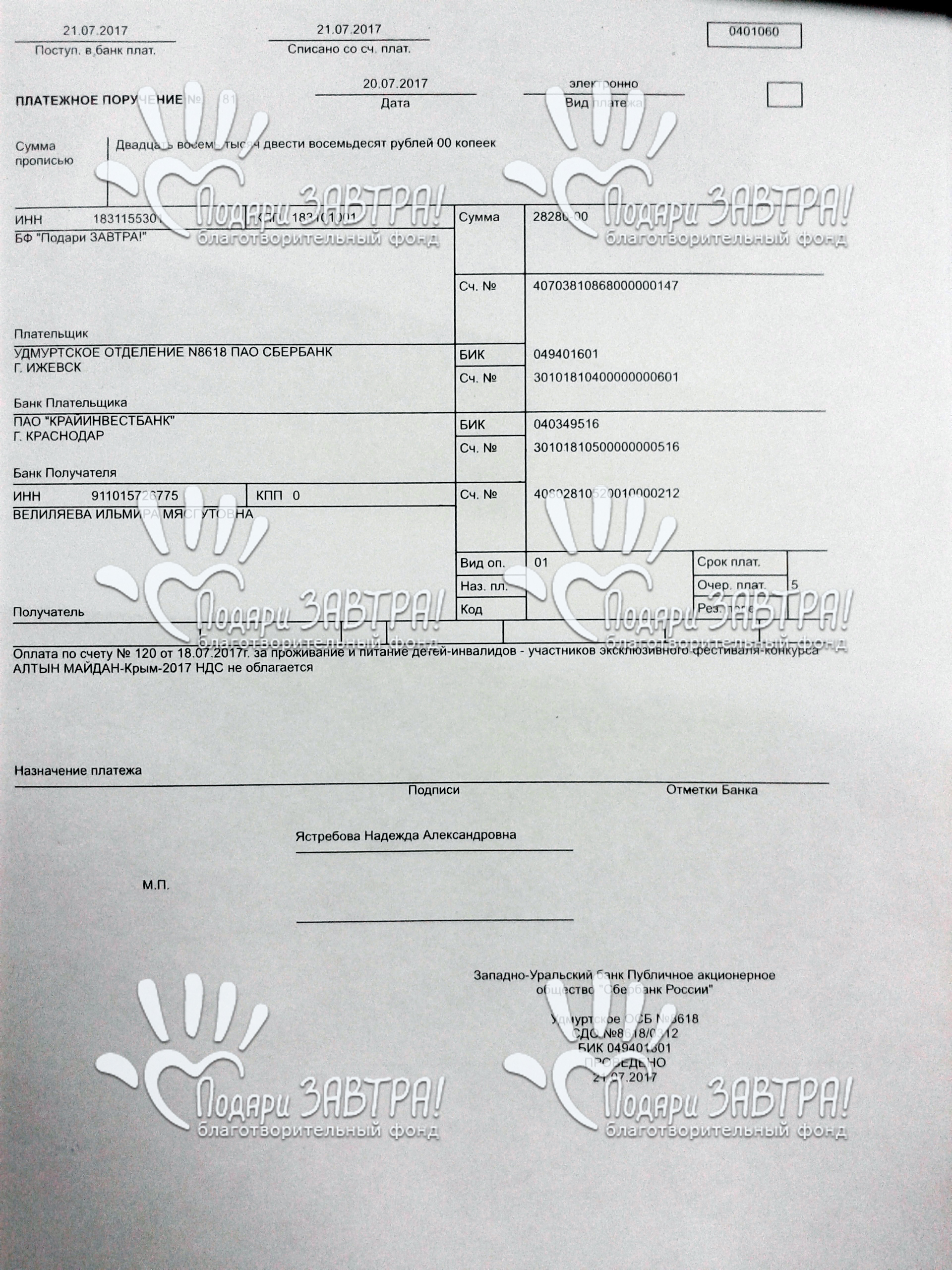 Оплачено проживание и питание Лены Чулкиной и Саши Зашихина на инклюзивном фестивале-конкурсе "АЛТЫН МАЙДАН-Крым 2017"Благотворительный фонд «Подари ЗАВТРА!» оплатил проживание и питание Лены Чулкиной и Саши Зашихина на инклюзивном фестивале-конкурсе "АЛТЫН МАЙДАН-Крым 2017"