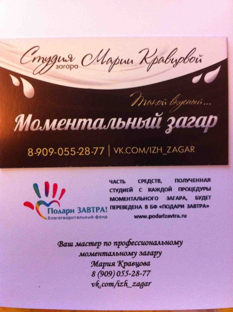 В декабре 2013 года СТУДИЯ МОМЕНТАЛЬНОГО ЗАГАРА МАРИИ КРАВЦОВОЙ проводила акцию: часть средств, полученная с КАЖДОЙ ПРОЦЕДУРЫ моментального загара, была передана в благотворительный фонд "Подари ЗАВТРА"