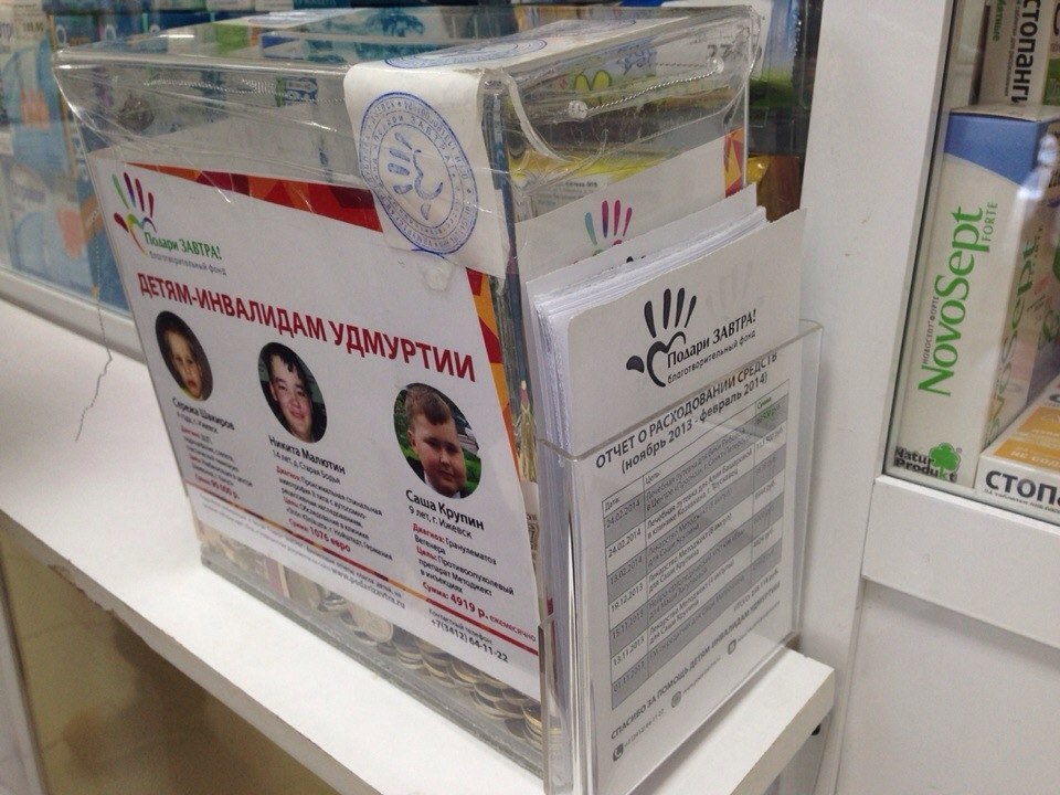 Во всех "Бережных аптеках" нашего города на ящиках для сбора пожертвований мы разместили карманы с отчетами о расходовании средств Фонда "Подари ЗАВТРА!" за ноябрь 2013г. по февраль 2014г.