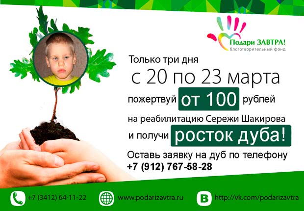 Волонтеры Фонда рассказали об акции "Посади ДУБ! Подари ЗАВТРА!" в программе "Вести.Утро" на телеканале "Россия 1" - http://youtu.be/lRC5lw9csu0 О том, как стать обладателем ростка дуба (и помочь ребенку-инвалиду Сереже Шакирову из Ижевска) - http://www.podarizavtra.ru/offers/tree.html |